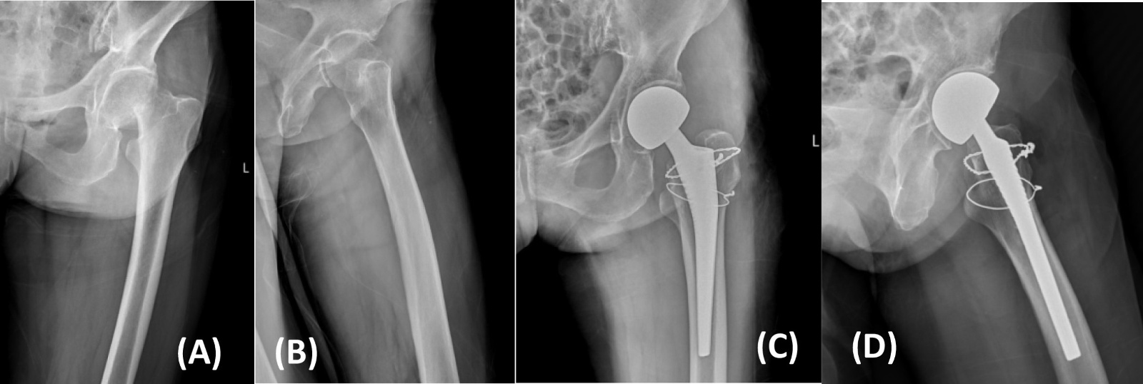 Figure 1. X-rays before and after modified hardinge approach hemiarthroplasty in a 70-year-old female patient with right femoral neck fracture (Garden type III) (A), (B). Before operation; (C), (D). After operation
