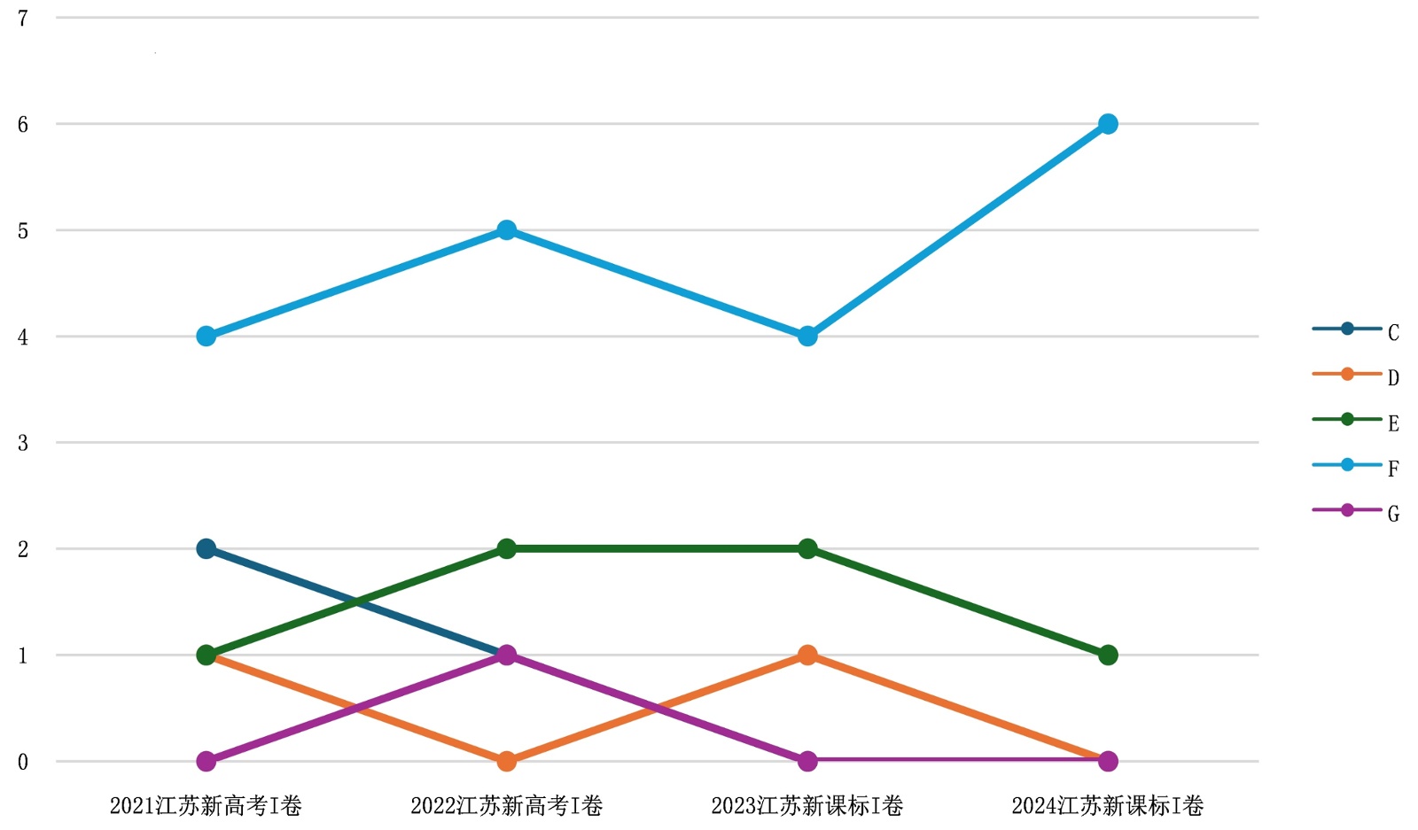 第三,考点E理解目的题的数量呈现初步上升趋势。2021年及2024年分别设置1题,2022年及2023年考查数量为2题。尽管总体数量仍不多,但增长趋势表明命题者逐渐重视对写作意图和语篇功能的考查。