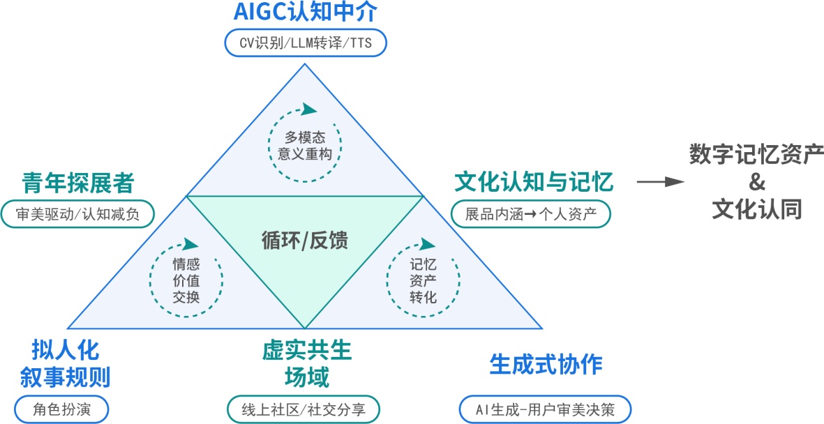 针对记忆流失与资产化难题,模型确立了“AI智能生成–用户审美决策”的新型人机协作模式。在传统的观展活动中,观众需要独自承担信息检索、理解、记录与整理的全部劳动,极易导致体验疲劳。而在新模型中,繁琐的内容生产工作(如文案撰写、版式生成、信息清洗)交由AI承担,用户则专注于核心的审美判断与收藏决策。这种分工机制极大地优化了记忆留存的效率,实现了从瞬时物理体验到持久数字资产的高效转化。最终,这种系统性的重构形成了“生产–交换–输出–循环”的良性闭环,彻底扭转了传统观展体验中的被动局面,实现了文化体验价值的整体跃迁。