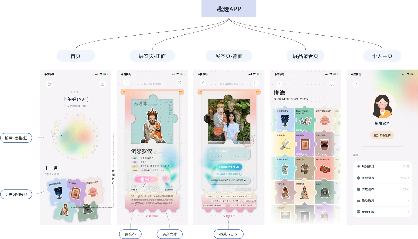 3) 双面卡片交互与记忆归档。为了承载用户的个人记忆,数字展签采用了“双面翻转”的交互形式。正面承载公共知识(科普),背面则留给用户进行个性化创作,不仅可以上传与展品的合影,还能记录碎片化的观展感悟。考虑到在社交分享时的创作压力,设计加入了文案润色功能:用户只需输入简单的关键词或心情,AI即可将其优化为通顺、优美的朋友圈文案,降低了内容生产的门槛。交互的最终落脚点在于“收藏”。所有被确认保存的卡片,都会以拼图碎片的形态归档至收藏中心。得益于前述统一的边缘形状设计,这些原本毫无关联、来自不同展览的碎片,能够在收藏页中无缝嵌合,随着时间的推移,自动拼贴成一面连续延伸的记忆墙。这种直观的视觉反馈,将抽象的观展经历转化为了可视、可积累的个人足迹。