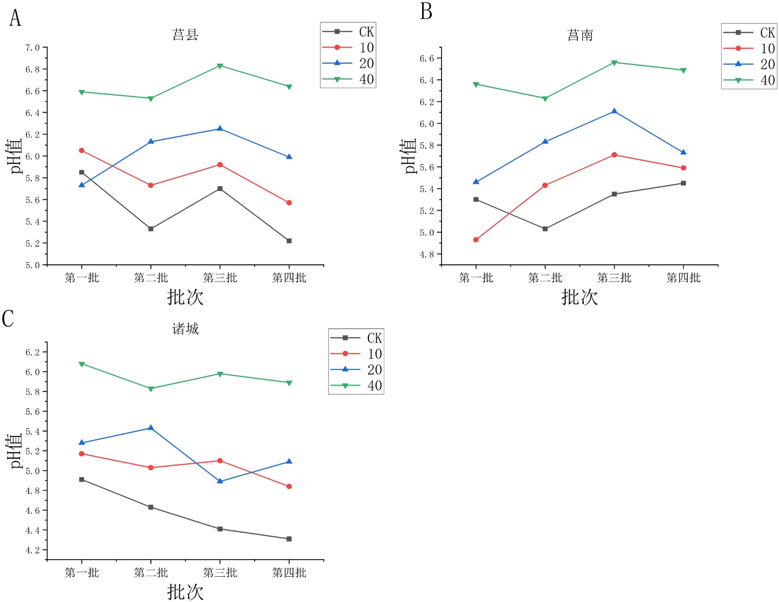 图1. 各烟区在不同牡蛎壳粉施用量下土壤pH值随各批次的动态变化综合图,A (莒县)、B (莒南)、C (诸城)