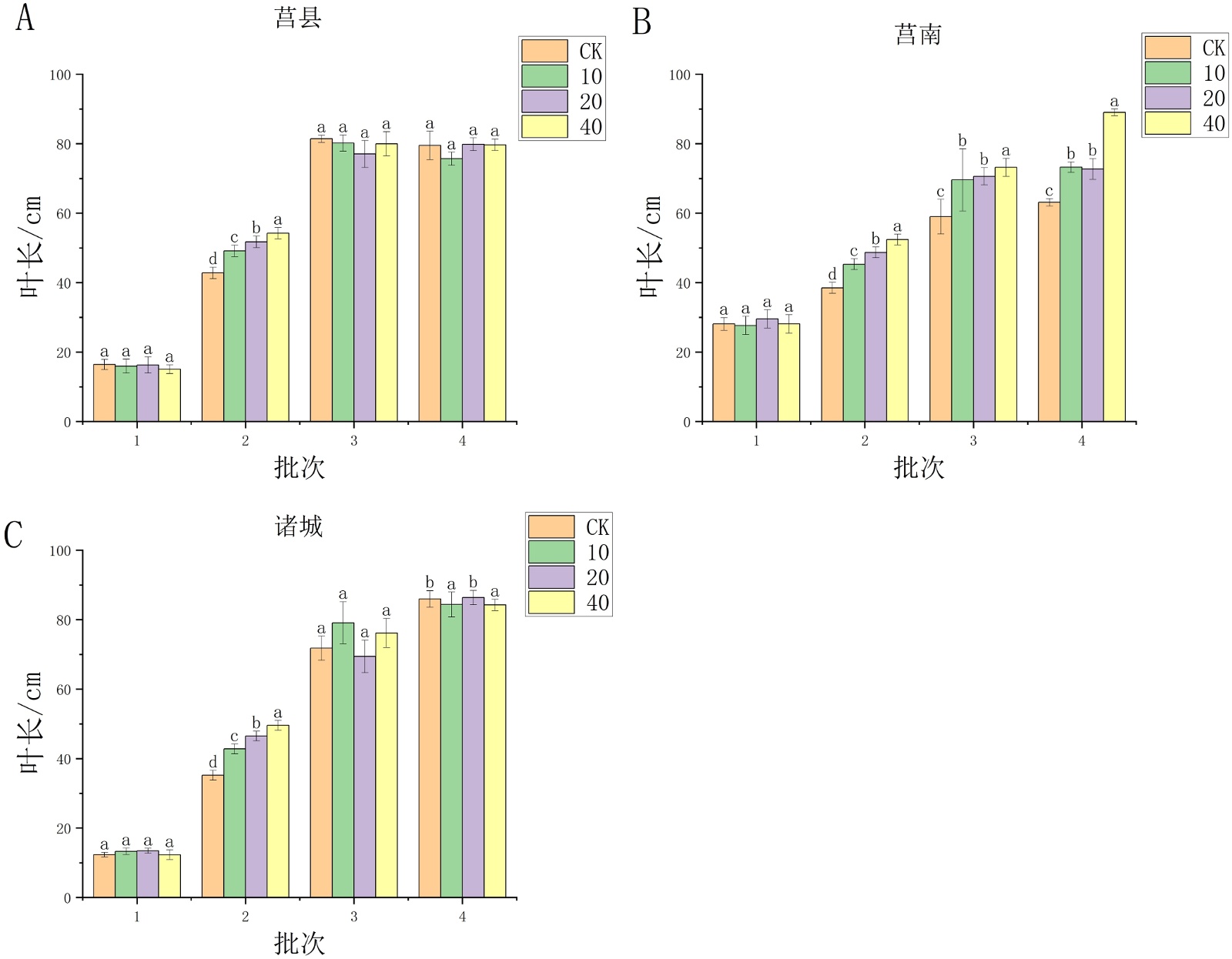 图2. 各烟区在不同牡蛎壳粉施用量下叶长的变化,A (莒县) B (莒南) C (诸城)