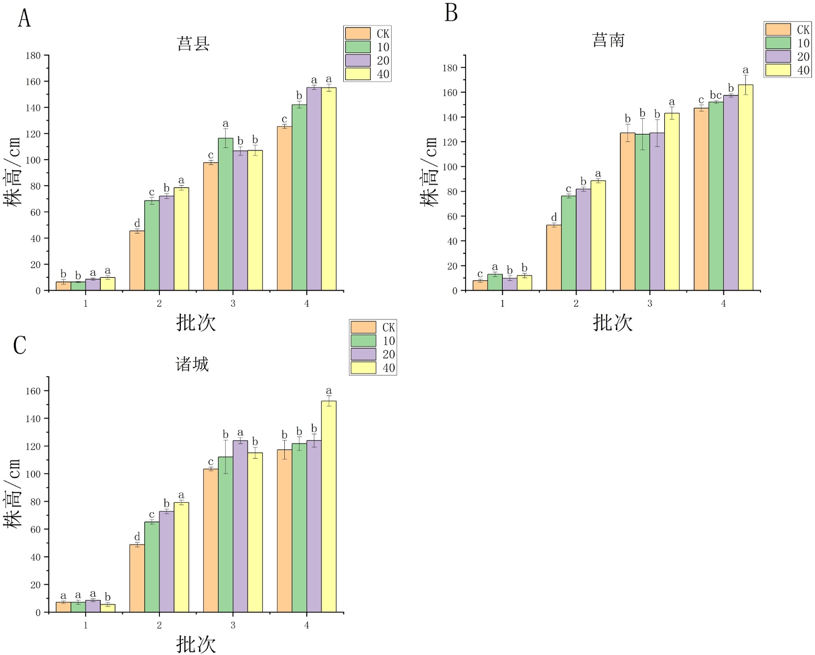 图4. 各烟区在不同牡蛎壳粉施用量下株高的变化,A (莒县)、B (莒南)、C (诸城)