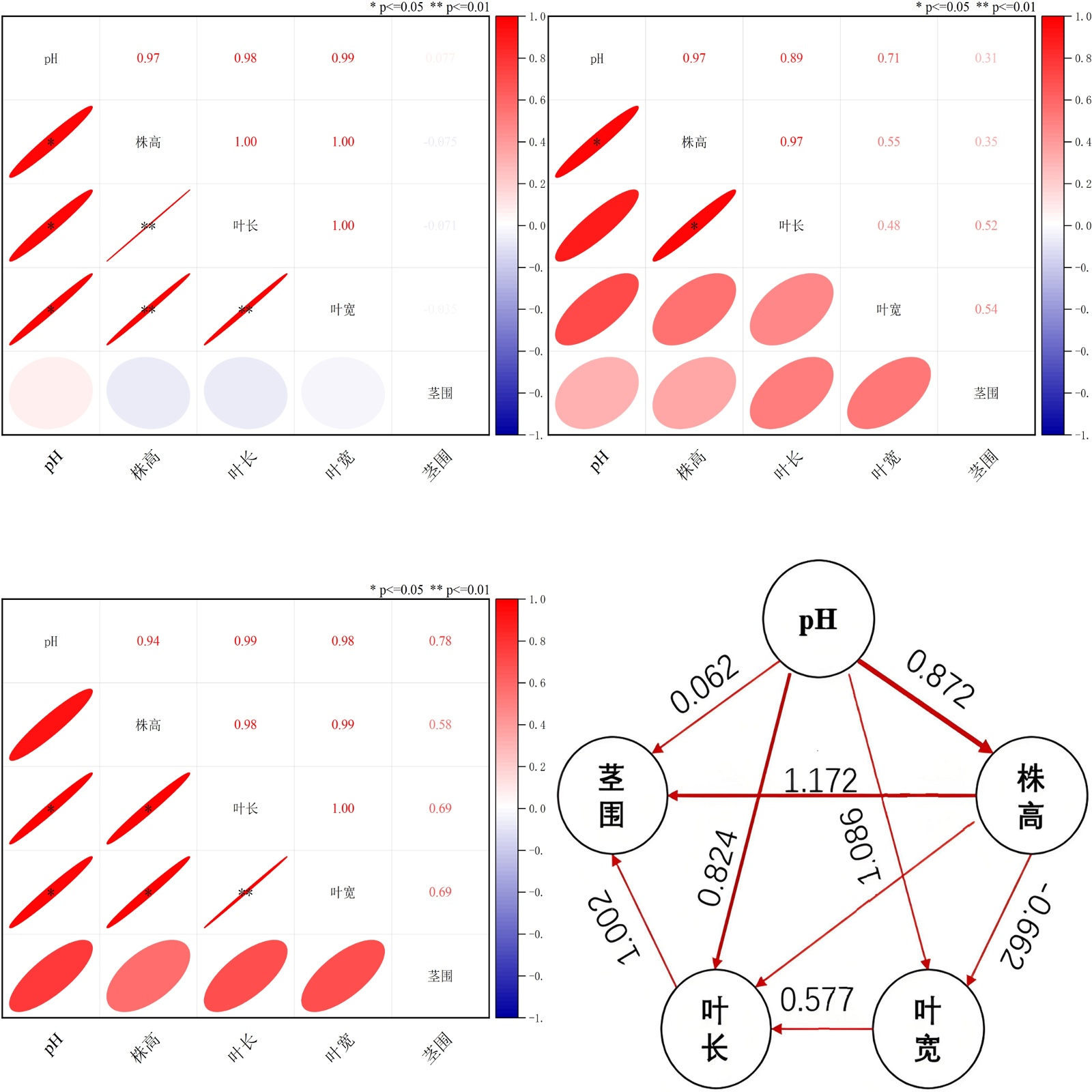 关系,且所有相关性均达到极显著水平(p < 0.01)。具体来看,土壤pH值与株高的相关系数约为0.87,与叶宽的相关系数约为0.86,与叶长的相关系数约为0.83,与茎围的相关系数约为0.79。尽管该烟区初始土壤酸度较强,且土壤理化性质可能与其他两个烟区存在差异,但牡蛎壳粉改良后土壤pH值的提升与烟草生长指标的改善仍呈现紧密的正相关联动,说明即使在强酸性土壤条件下,土壤pH值仍是调控烟草生长的核心环境因子,进一步验证了牡蛎壳粉通过调节pH值改善烟草生长环境的普适性。