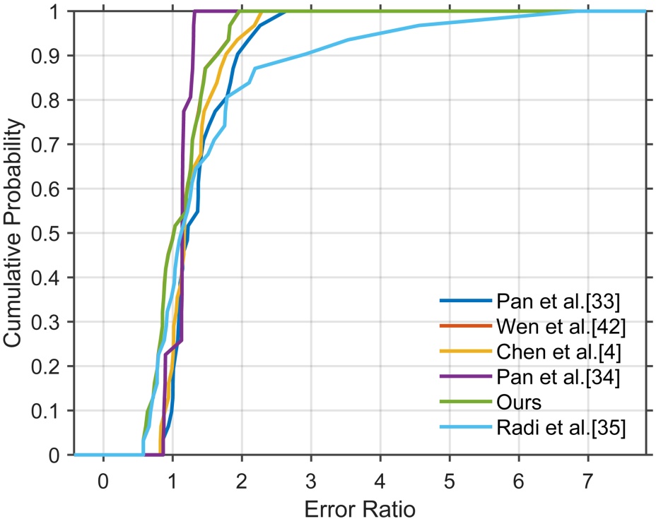 通过估计模糊核与真实模糊核分别恢复图像后,计算两者恢复结果的误差比率并绘制累计分布图。如图4所示,本文方法的累积误差比率曲线在误差比较小的区域上升极快,且更快趋近于1,这表明在绝大多数情况下,本文方法的误差比显著低于Pan et al. [25]、Wen et al. [13]等对比方法,误差控制能力更优。