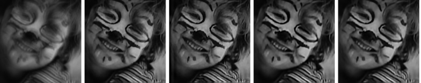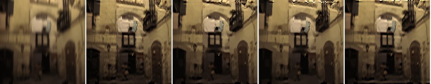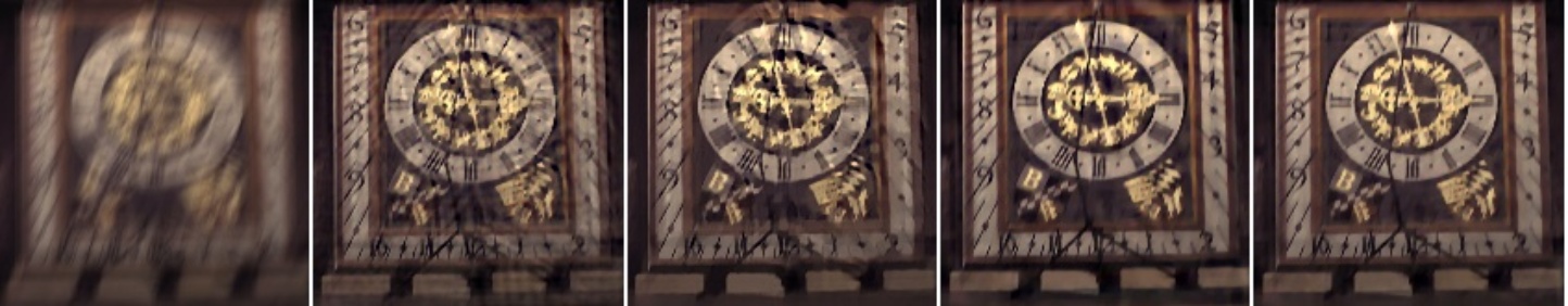 图5. 我们的去模糊算法的结果,与其他先进算法相比。从左到右:1) 输入模糊图像,随后依次为2) Chen等人[9]的结果,3) Wen等人[13]的结果,4) Pan等人[25]的结果,5) Pan等人[26]的结果,以及6) 我们的算法结果