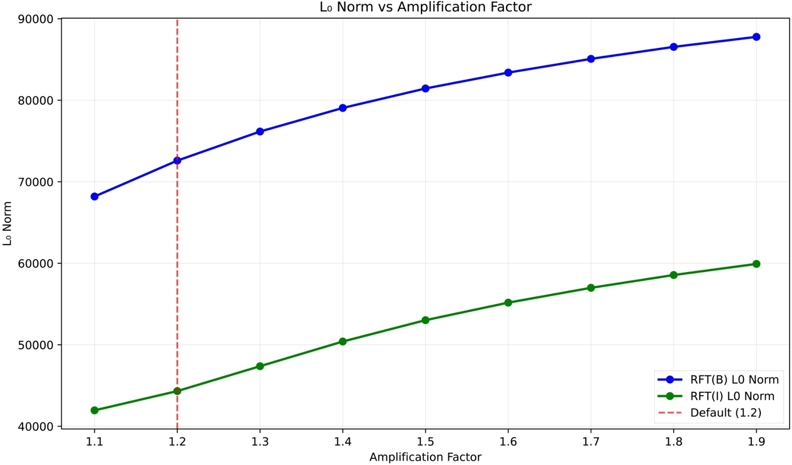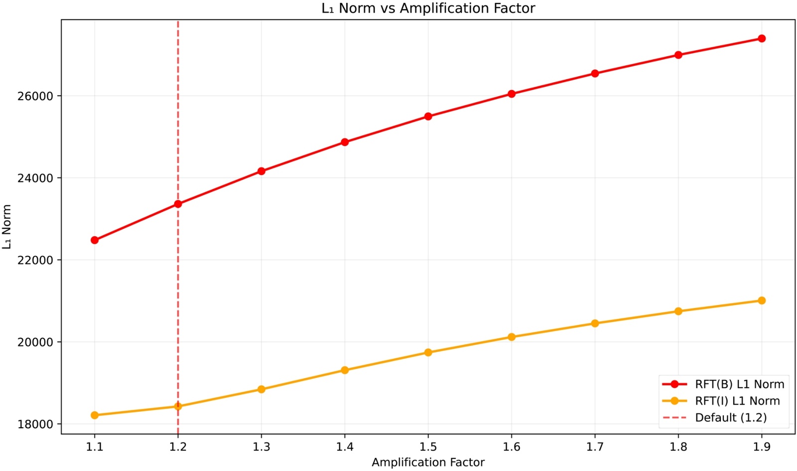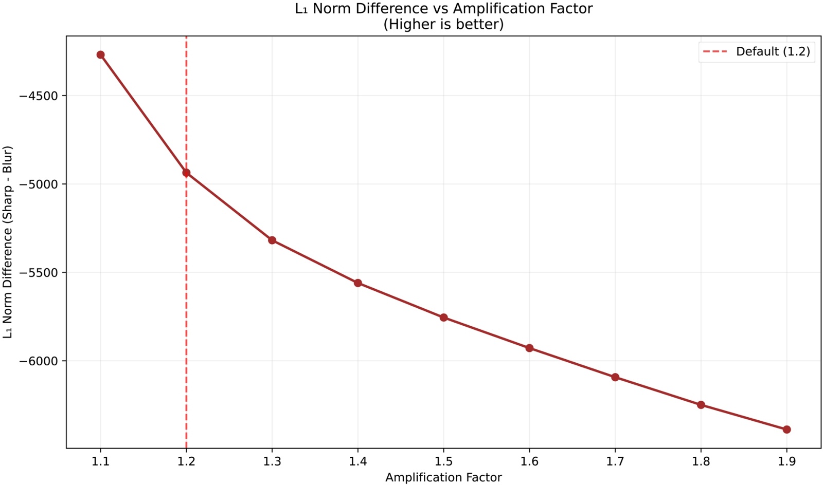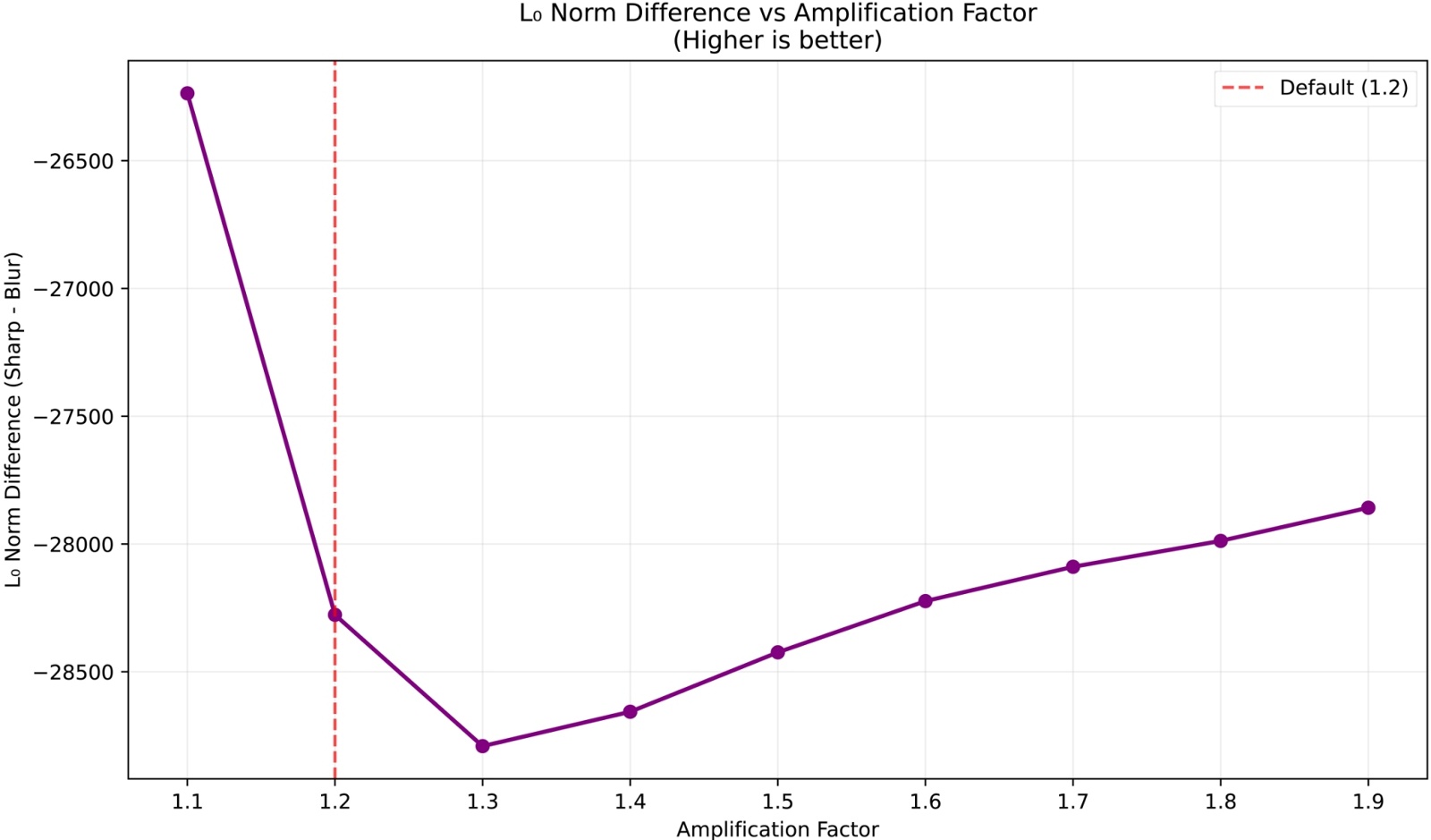 从图2可以清晰看出,在amplification = 1.2时,清晰图像与模糊图像的L0范数差异达到最大负值。L0范数衡量的是频率成分的稀疏性,差异值越负表明清晰图像相比模糊图像保留了更多有效的频率成分,同时抑制了噪声成分。说明1.2这个参数值能够最大程度地增强图像的重要频率特征,提升图像的锐度和清晰度表现;L1范数差异图,在1.2处也呈现出较好的区分效果。