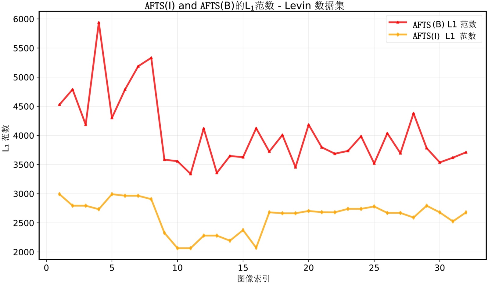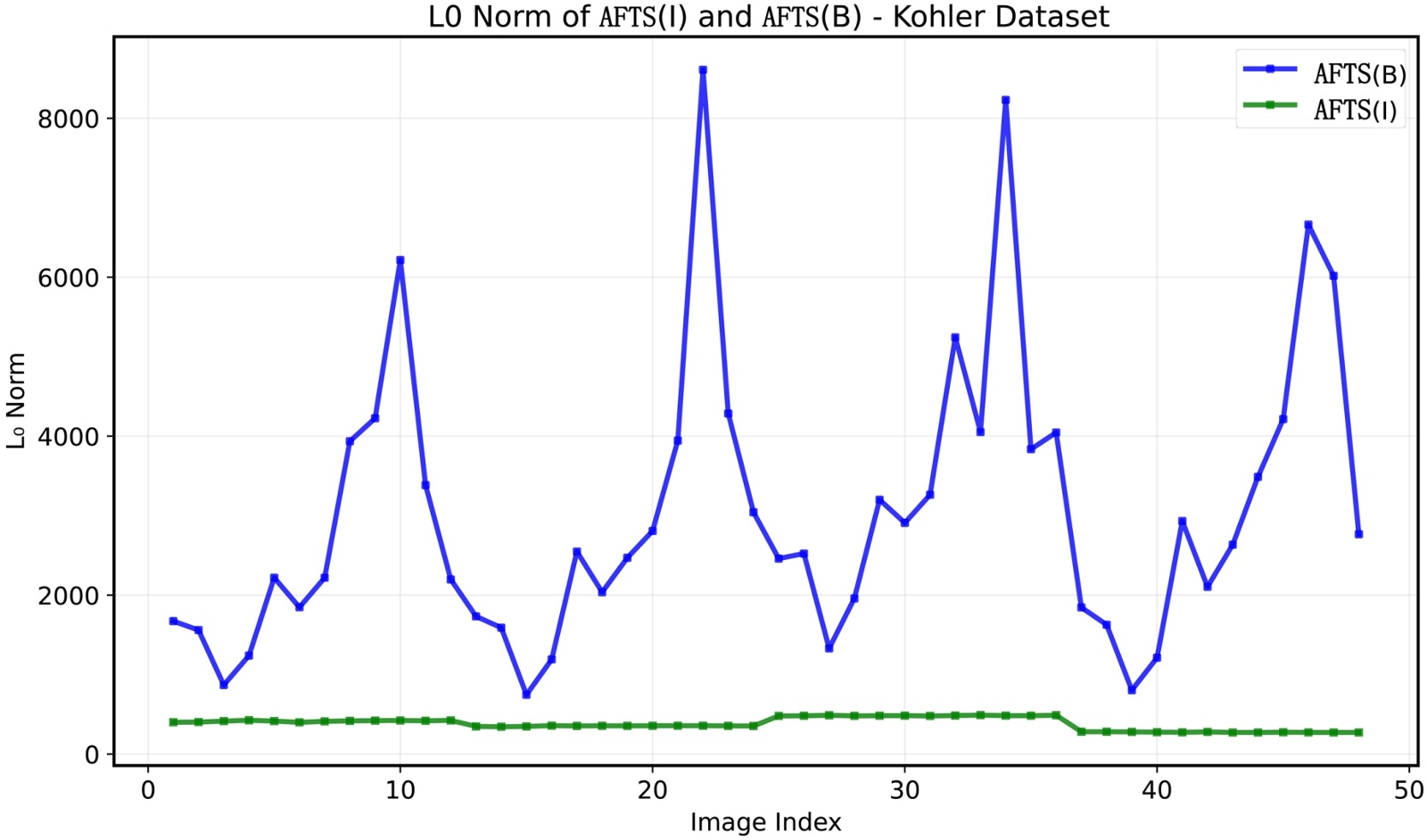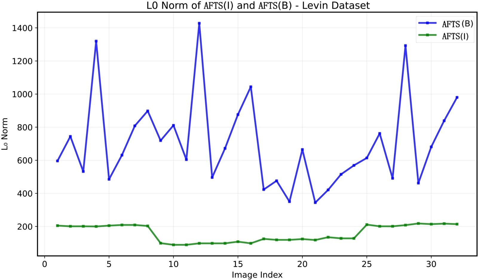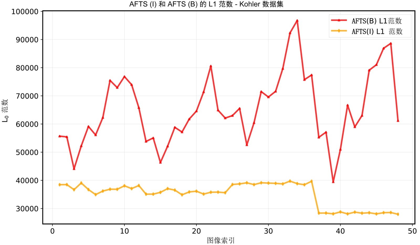 我们对来自不同数据集的图像进行AFTS处理,包含Kohler [16]、Levin [17]等人提供的一个数据集,图3展示了当AFTS操作应用于模糊图像和其对应的清晰图像时L0范数和L1范数的变化情况。图中显示了经过AFTS处理后,模糊图像的稀疏性降低。