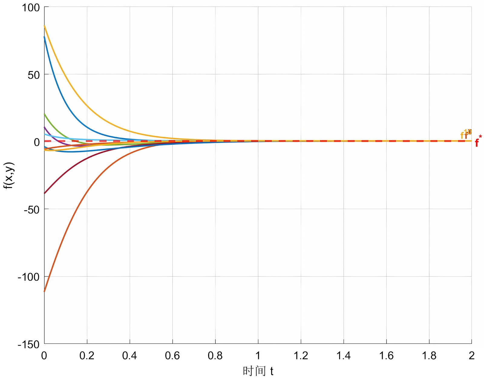 本节对前面的理论分析提供两个数值算例来进行验证,展示本文所提出的神经网络的有效性和可行性。与文献[25]相比,本文不仅在单目标优化问题的研究基础上拓展成了min-max的鞍点问题,而且还继承了文献[25]中神经网络的指数收敛性和有效时间内收敛的特性。本节的所有数值实验均在 MATLAB 编程环境下进行。