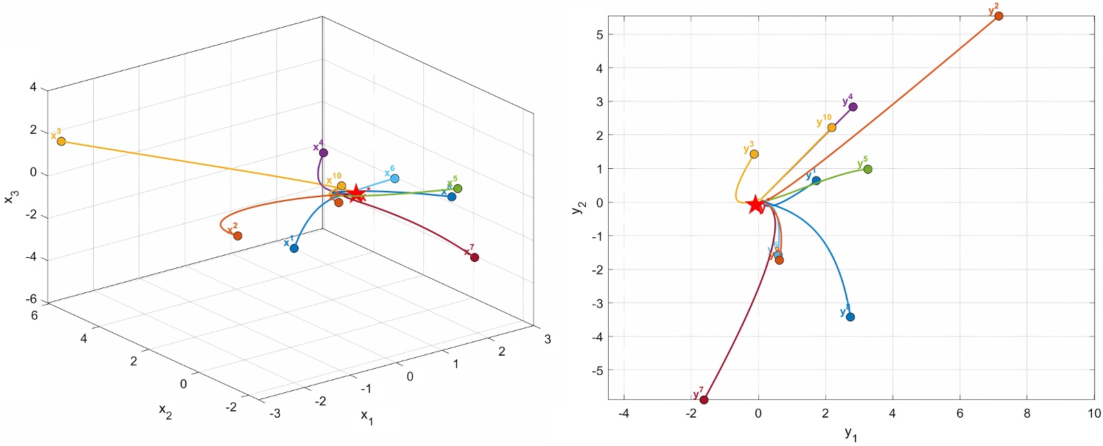 图2中的左右两图分别展示了x,y分量的收敛轨迹,10条不同颜色的轨迹线从随机初始点出发,均收敛到点