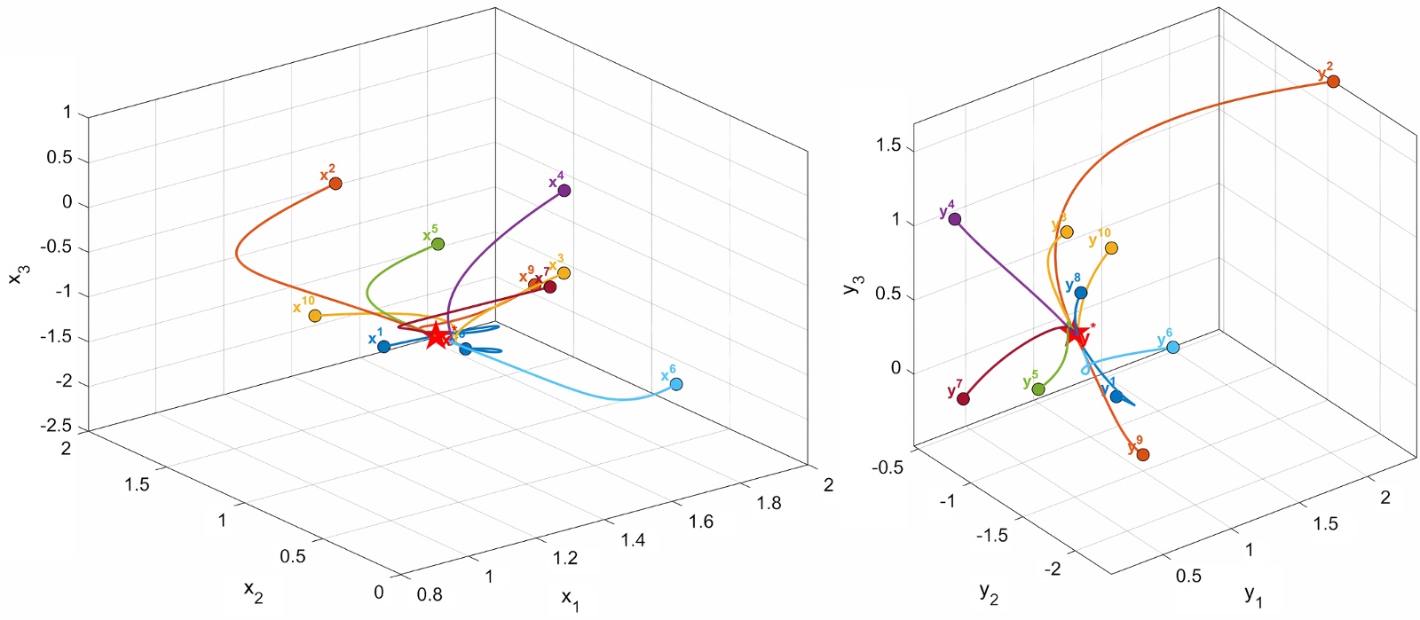 同样,本文用改写后的神经网络(34)在MATLAB环境下采取随机生成10组初始点来进行数值模拟,数值仿真结果如图3和图4所示。与例5.1相比,该问题具有更高的维度和更复杂的动力学特性,但本文提出的神经网络仍能有效收敛。