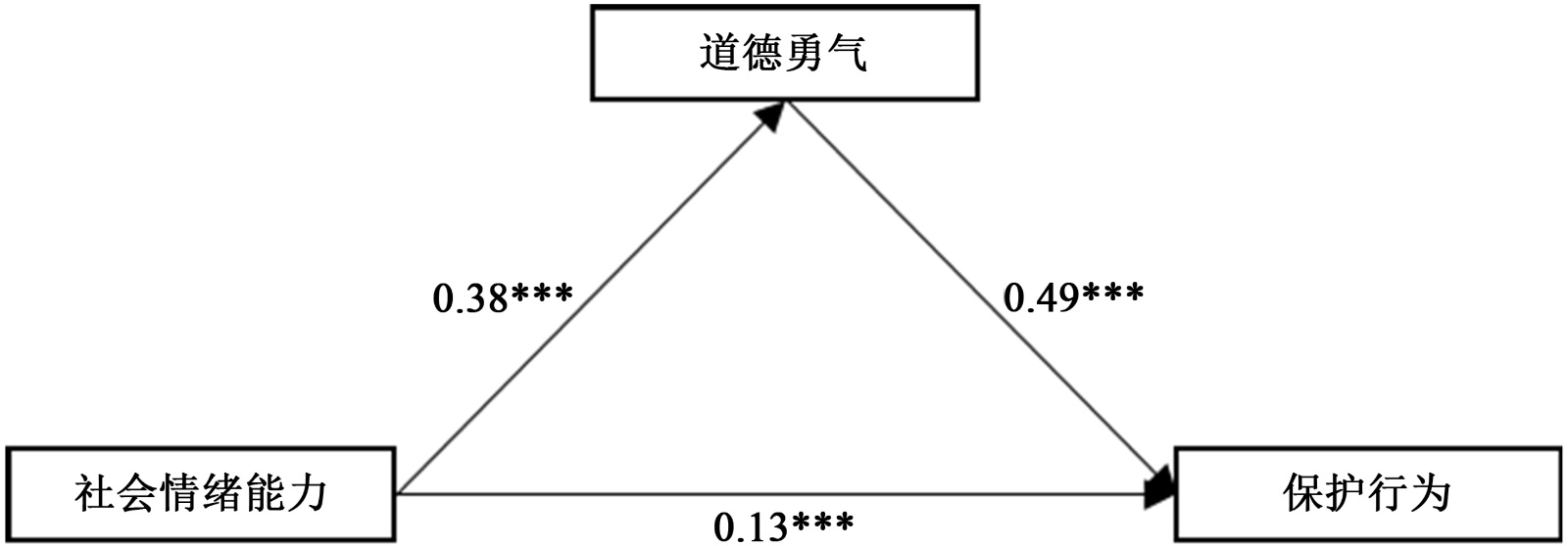 本研究考察了社会情绪能力对保护行为的影响,并检验了道德勇气在其中的中介机制。结果清晰地表明,社会情绪能力对保护行为具有稳定的正向预测作用,H1成立。