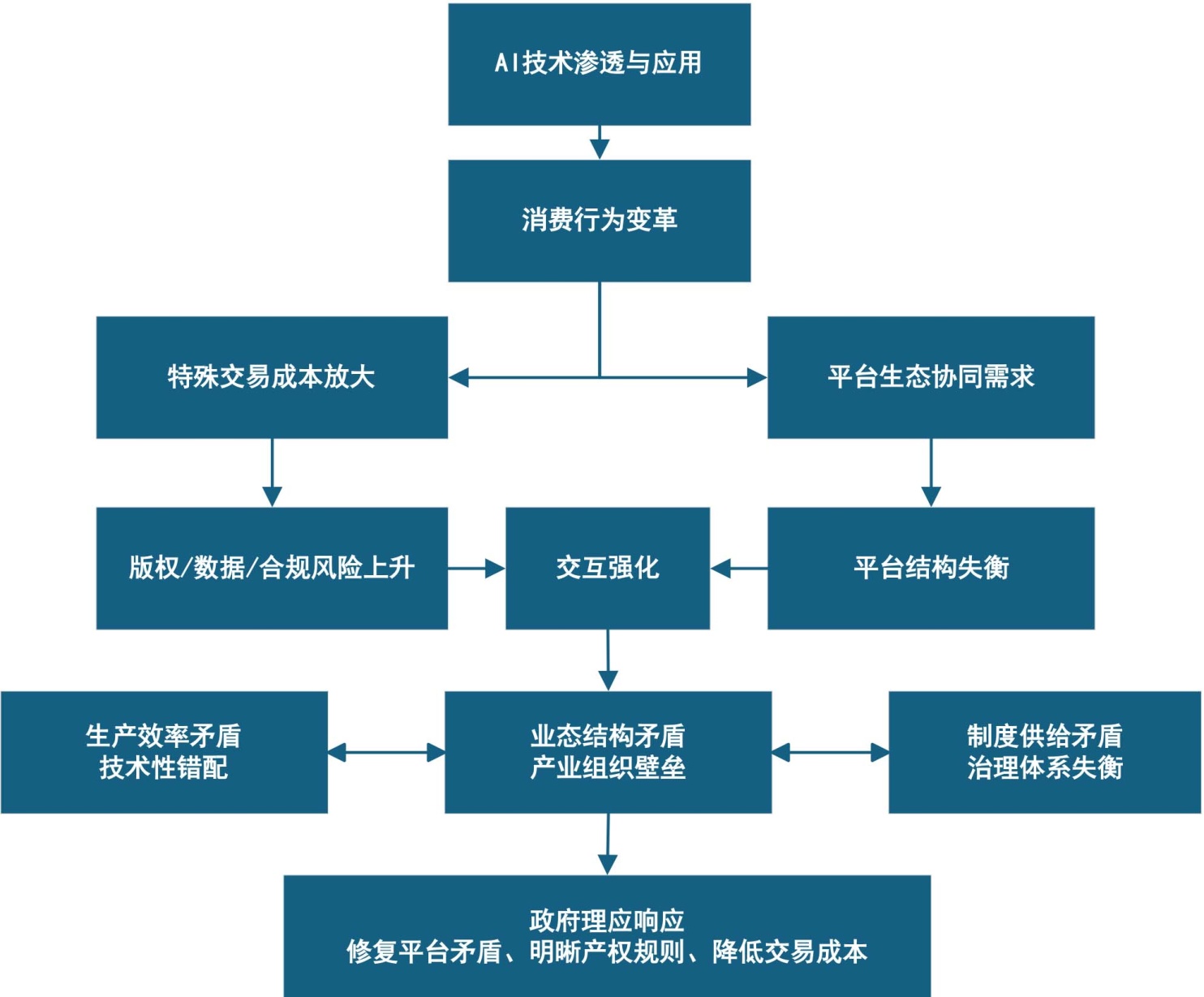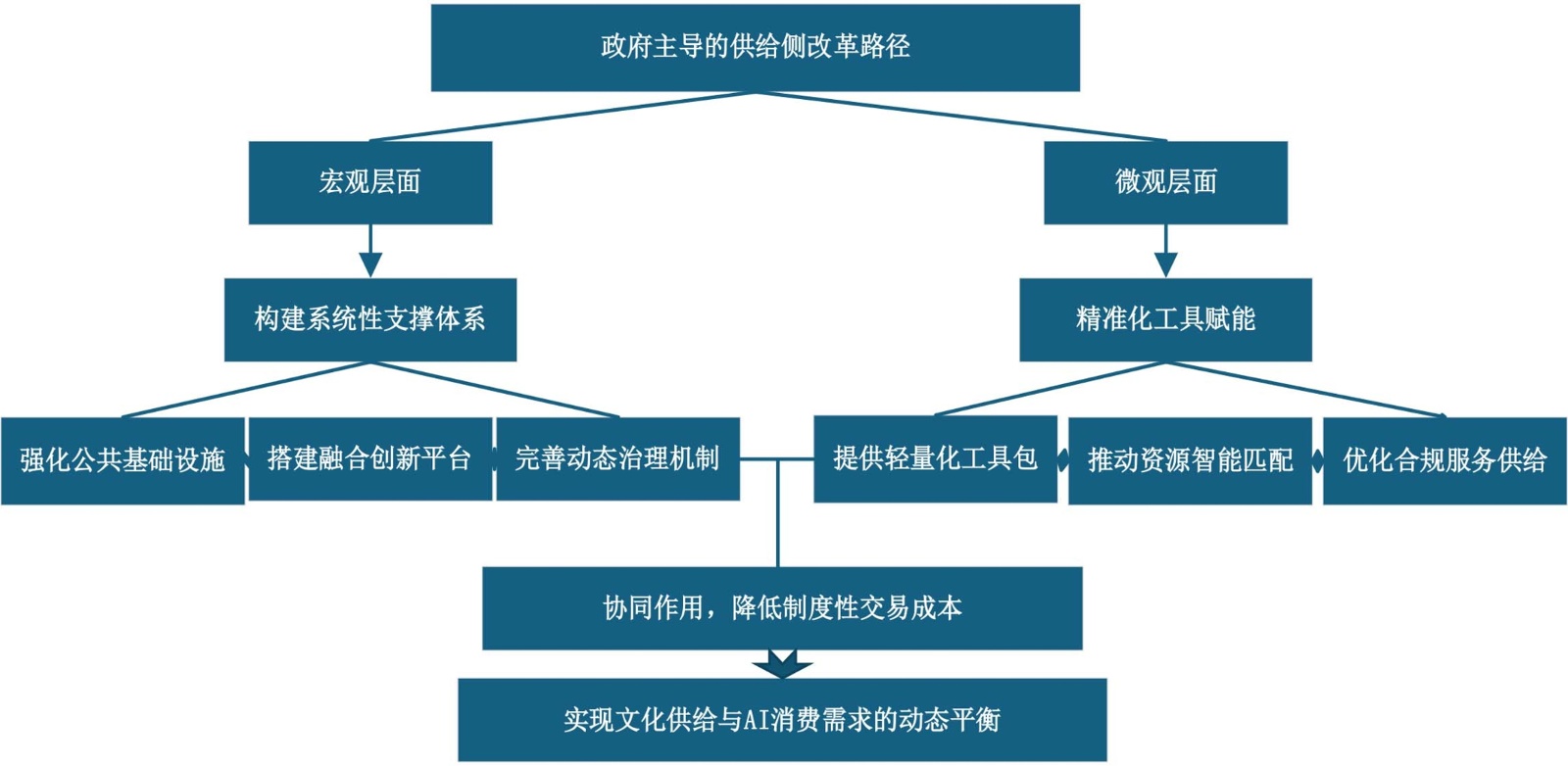 本模型的理论贡献在于,它超越了单一理论视角的局限,通过厘清“平台结构”与“交易成本”这两大关键中介变量,系统揭示了从技术冲击到结构矛盾的内在机制。它不仅为理解文化供给侧面临的复杂挑战提供了一个整合性分析框架,也自然导向了政府干预的必要性与逻辑起点:正是由于市场自身难以克服平台失灵与制度性交易成本过高的问题,政府的核心职能便在于通过战略性公共政策来修复生态、明晰规则、降低成本,从而为破解供给侧矛盾、实现供需动态平衡提供根本路径。