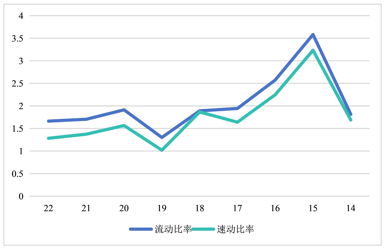 根据阿里巴巴2014年~2022年流动比率和速动比率绘制相应的趋势图,见图1所示。