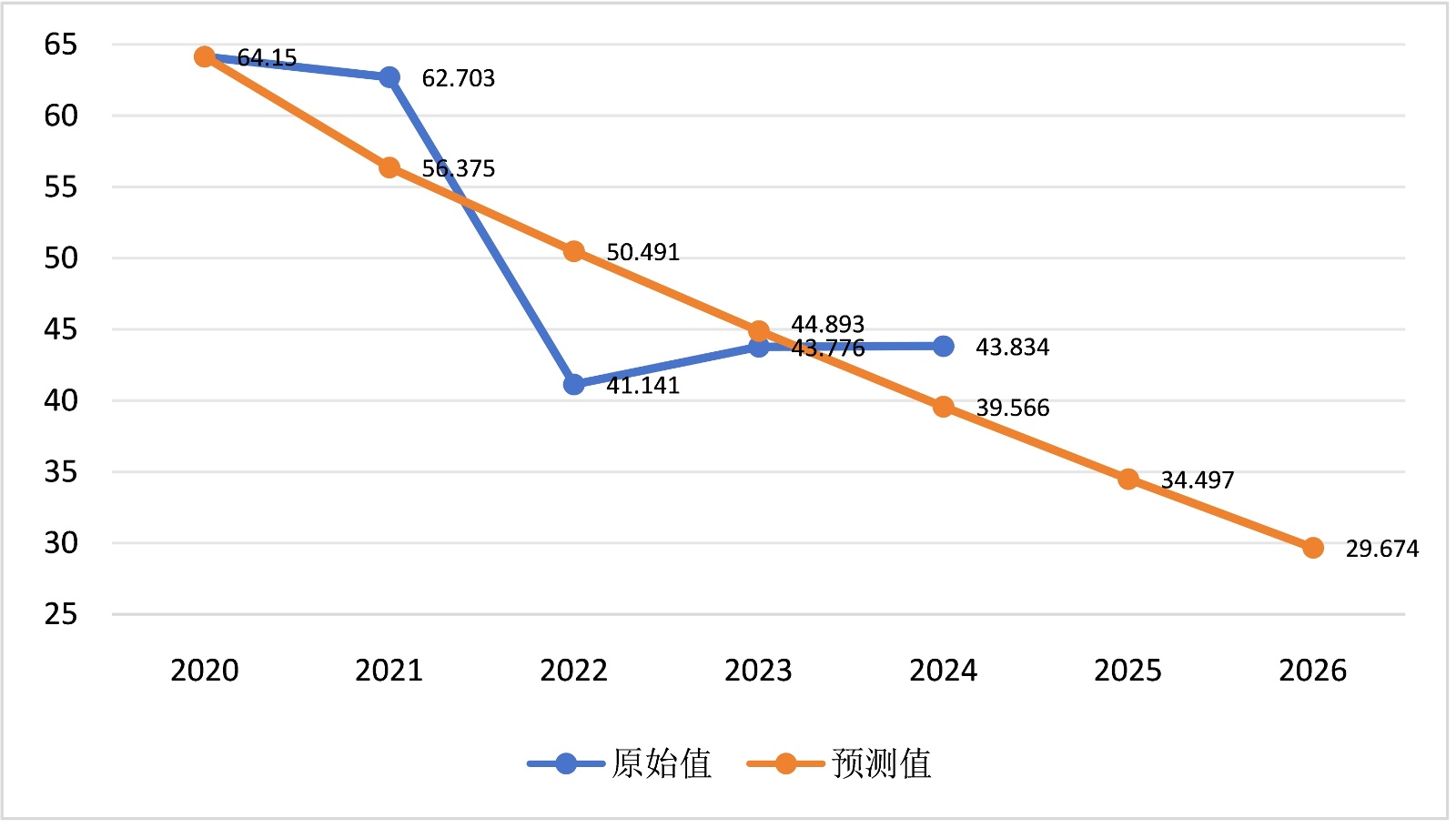 表11是灰色预测模型的拟合结果表。相对误差值越小越好,一般情况下小于20%即说明拟合良好。本文模型2020~2024年的平均相对误差为9.022%,意味着模型拟合效果良好。