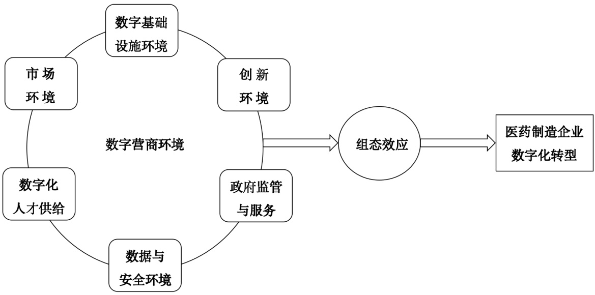 基于复杂系统理论,医药制造企业数字化转型呈现多要素协同、多路径并存的复杂系统特征。数字营商环境作为重要外部驱动因素,其六大构成要素能够通过相互协同产生整体效应[34]。本研究进一步借鉴生态系统理论,将医药制造企业数字化转型视为其与外部数字营商环境生态系统互动的过程。该生态系统由多个相互关联的环境维度构成,为市场主体提供生存与发展的外部条件[35]。结合资源基础观与制度理论,数字营商环境的各个维度既为企业提供关键的资源支撑,也通过制度约束与激励塑造其转型的边界与动力结构。具体而言,六个维度的选择基于其对医药制造企业特有转型瓶颈的针对性回应。医药行业的强监管性要求清晰、稳定且高效的政府监管与服务,以降低合规风险与制度性交易成本,缓解企业不敢转的顾虑。高数据敏感性,包括患者隐私、研发数据和商业机密的保护需求,使得健全的数据与安全环境成为企业共享和利用数据的前提。长研发周期和高技术壁垒意味着企业迫切需要持续稳定的创新环境政策支持以跨越创新的回报周期,同时依赖专业的数字化人才供给以解决转型的核心技能约束。而数字基础设施作为物理基础,直接影响数据流通与系统互联能力,对保障研发数据完整性与生产质量可控性至关重要。最终,良好的市场环境则通过需求信号引导企业投资数字化转型,为高投入的转型活动提供市场激励。