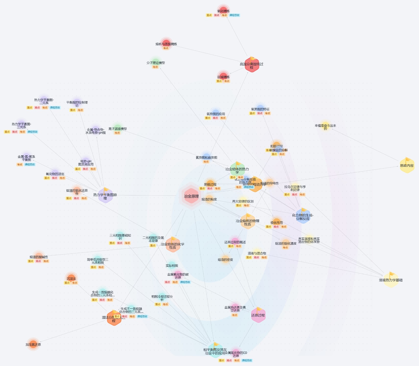在超星平台冶金原理课程建设后,课程教学团队依托超星平台逐步开展了线上线下混合式教学改革。由于课程资源知识点的独立呈现,无法将课程内容有机联系起来。然而,知识图谱作为一种教学资源整合手段,将知识点与教学资源,如教材、试题、讲义、案例等以知识脉络的方式有效连接,实现信息的精确检索和拓展。这种结构化的方式可以帮助教师更清晰地组织和呈现教学内容,使学生能够快速定位关键概念,降低认知负荷。冶金原理课程各章节知识点之间脉络关系如图1所示。
