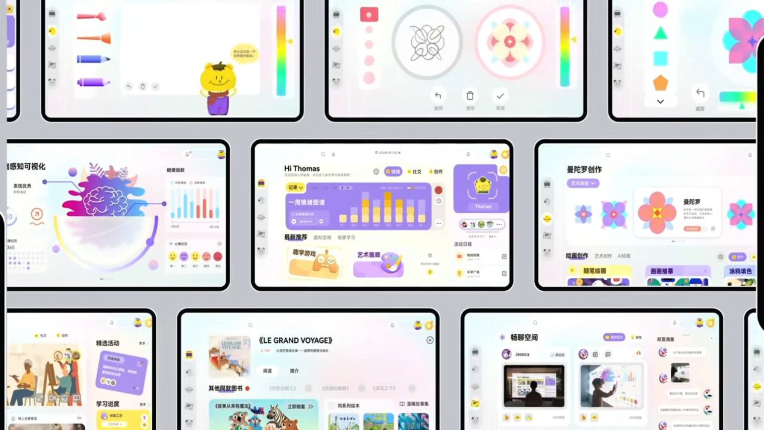 具体功能设计,针对认知衰退,引入了曼陀罗艺术疗愈游戏。该功能基于心理学家荣格的理论,通过绘制非表达性图形实现情绪稳定。界面设计放大色块和符号,方便老年人触控,同时融入游戏化元素提升参与度。平台的重要界面效果图如图3所示,展示了整体架构和用户流程。
