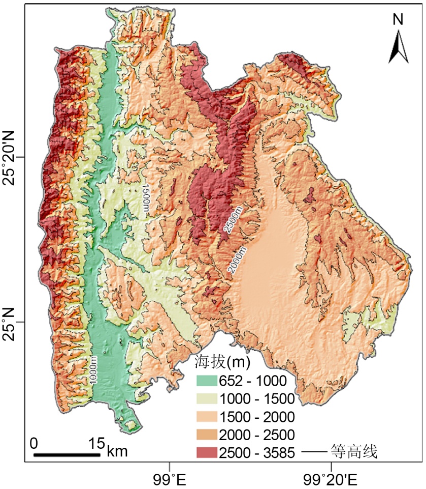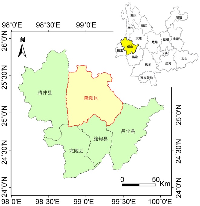 隆阳区,位于云南省西部、横断山脉南端,地跨东经98˚43'~99˚26'、北纬24˚46'~25˚38'之间[10]。东隔澜沧江与永平县相望,东南与昌宁县交界,南与施甸县相连,北与大理州云龙县毗邻。南北长约96千米,东西宽约78千米,总面积5011平方千米[10]。隆阳区,隶属云南省保山市,是保山市委、政府所在地,位于云南省西部、横断山脉南端(见图1)。东隔澜沧江与永平县相望,东南与昌宁县交界,南与施甸县相连,北与大理州云龙县毗邻,总面积5011平方千米[10]。2022年,隆阳区常住人口90.2万人,户籍人口94.66万人[11]。隆阳区位于云南省西部(98˚43'~99˚26'E, 24˚46'~25˚38'N),为保山市政治、经济、文化中心。全区总面积约5011 km2,2022年常住人口90.2万人[10]。地形以中山、盆地为主,属横断山脉南延部分,北高南低,平均比降14.5%。境内河流分属怒江与澜沧江水系,主要河流包括东河、勐赖河等[11]。气候属亚热带高原山地气候,年均温15.9℃,年均降水量约988 mm。土壤类型多样,以红壤、黄壤、水稻土等为主。植被垂直分异明显,生物资源丰富,高黎贡山国家级自然保护区部分位于区内,具有较高的生态保护价值[10] [12]。