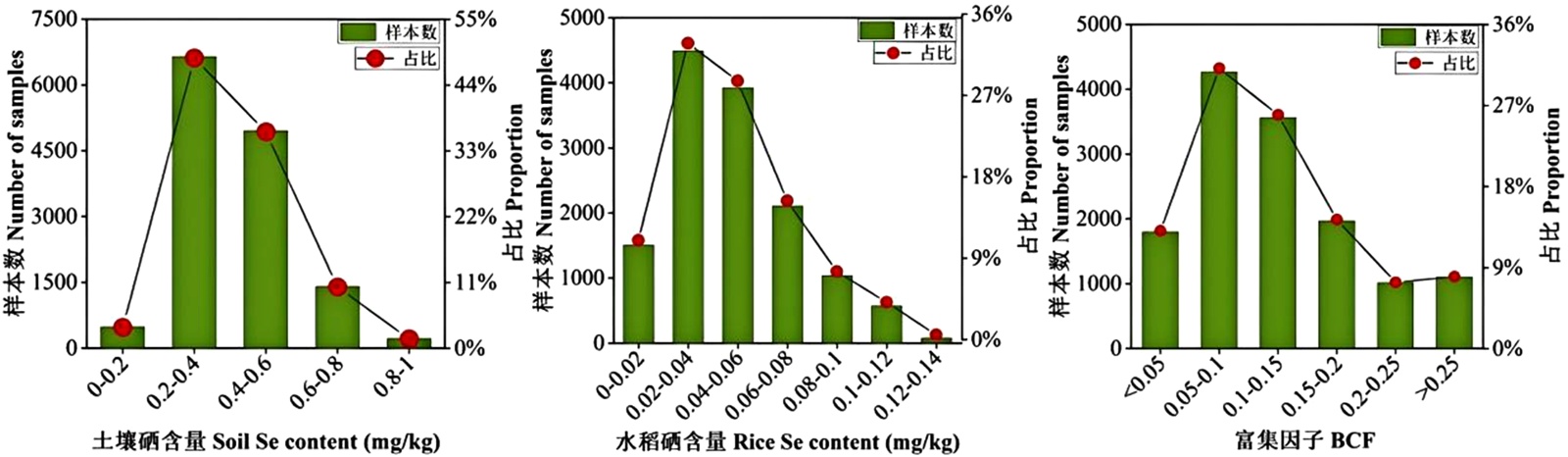图2. 湘西耕地土壤–水稻系统中硒含量与BCF频率分布图