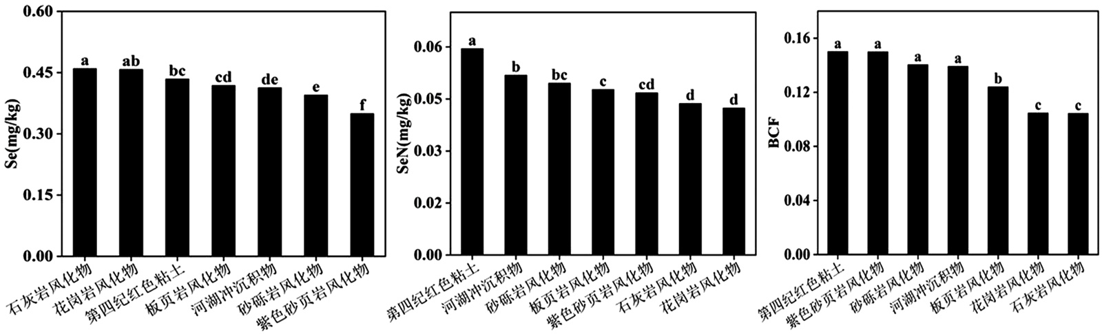 在大多数文献里成土母质一般被认为是土壤Se的主要来源[25]。在本研究中,七种成土母质发育而来的稻田土壤Se含量存在显著差异(p < 0.05),石灰岩风化物母质发育的土壤容易富集硒元素,这可能由于成土过程中持续的钙供应延缓了脱硅富铝化淋溶,形成了高阳离子交换量、高盐基饱和度的土壤环境,保肥性强且有机质丰富,有效吸附并保存了硒[26]。然而,本研究发现该类母质上水稻硒含量及BCF反而较低,其中储存的硒可能多以固定态存在,生物有效性不高。紫色砂页岩母质形成的紫色土,因母岩年轻疏松、易受侵蚀、土层浅薄,硒元素极易流失,故含量较低。根据表3可以发现石灰岩母质和花岗岩母质发育而来的土壤其中Cu、Zn和有机质的含量都要高于其他母质发育而来的土壤,土壤中的Se可能更容易被金属元素及有机质吸附固定,从而降低硒的生物有效性。而低分子量有机酸能溶解并释放土壤固定态硒,提高硒的生物有效性[27]。