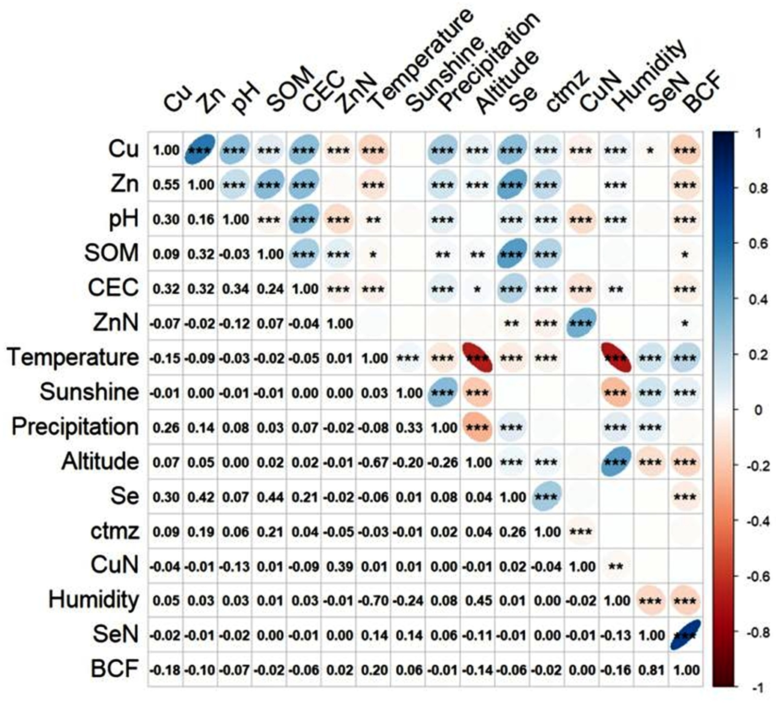 Figure 5. Relationship between soil physicochemical properties (SOM, CEC and pH), essential micronutrients (Cu and Zn) and climatic factors (sunshine, temperature, precipitation and humidity) and altitude and soil selenium, rice selenium and enrichment factors