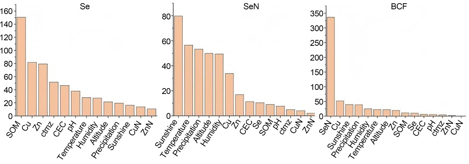 图6. 基于随机森林模型的稻田土壤Se、水稻Se、BCF的重要性排序图