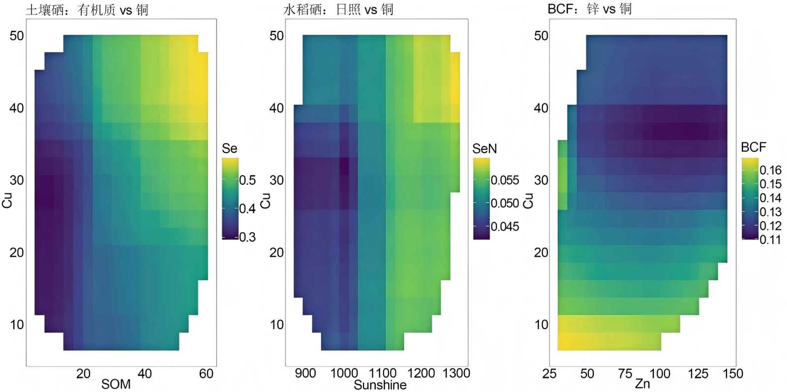 图7. 基于随机森林模型的稻田土壤Se、水稻Se、BCF的交互偏依赖图