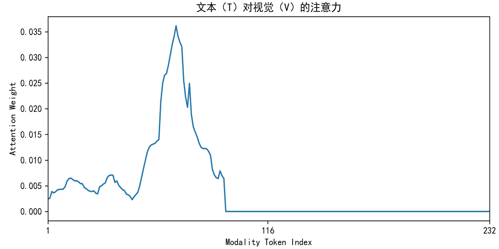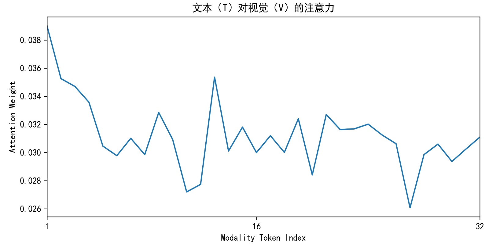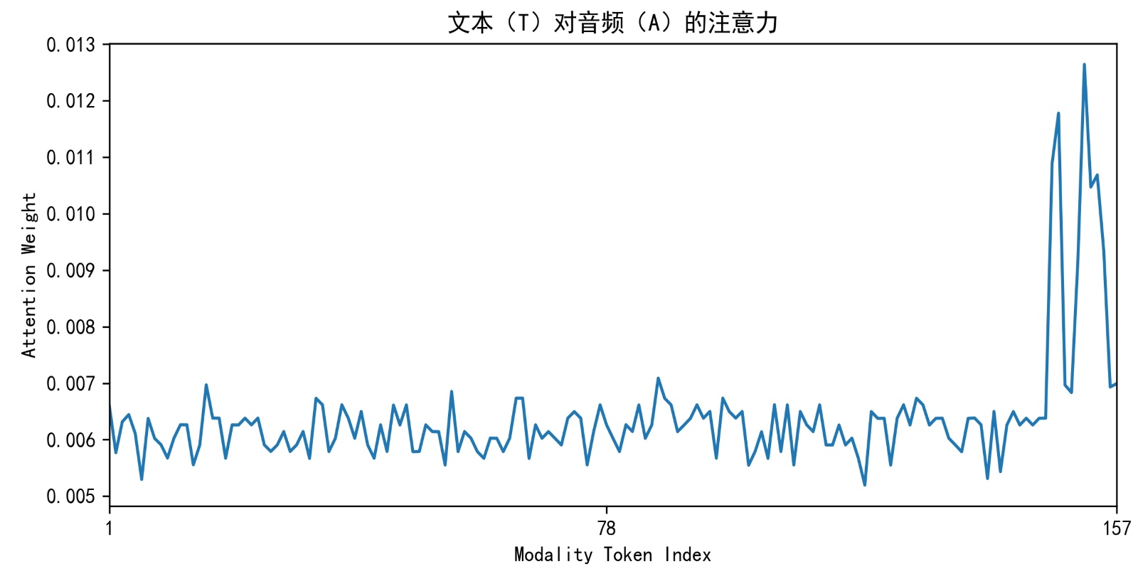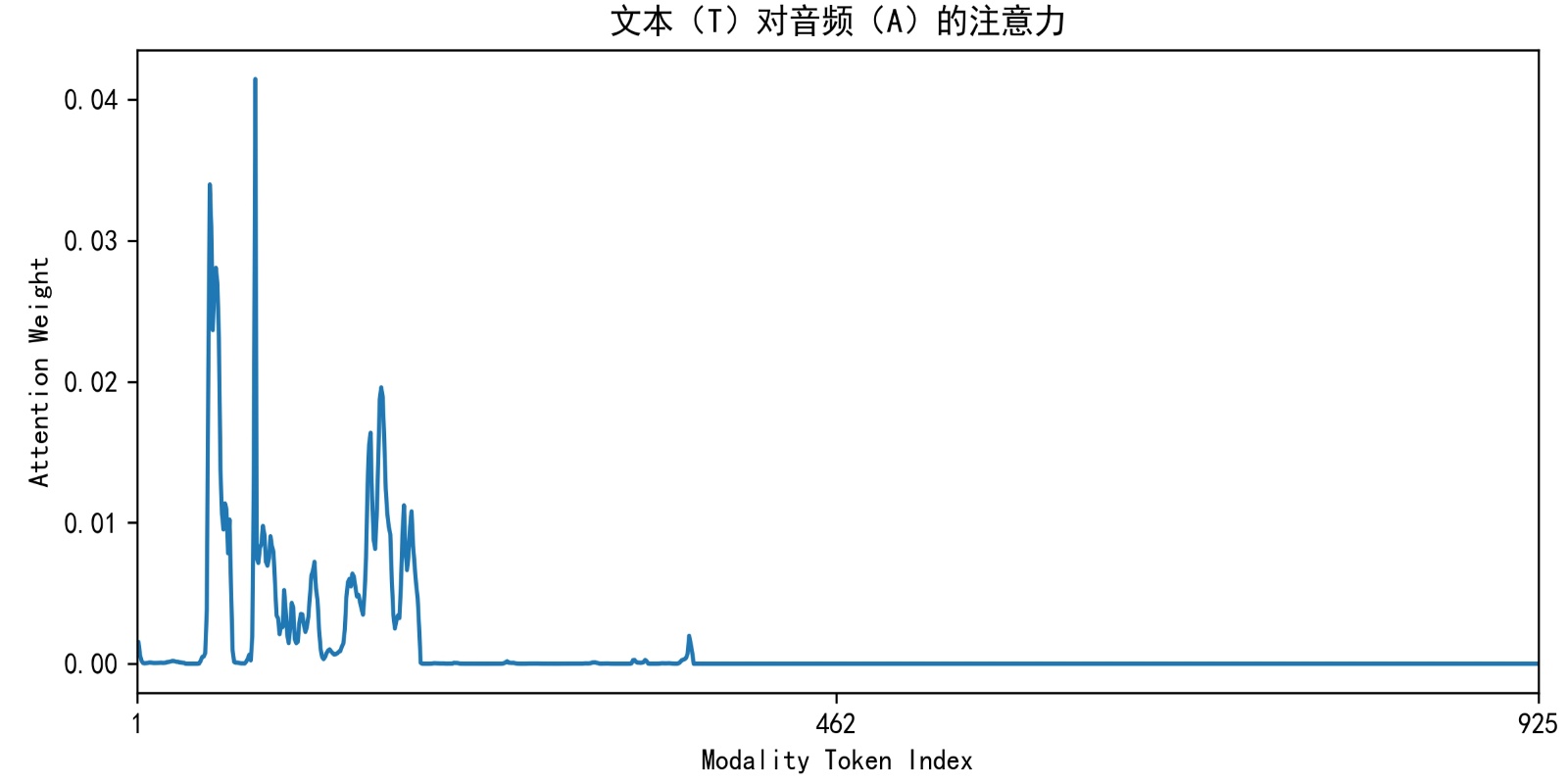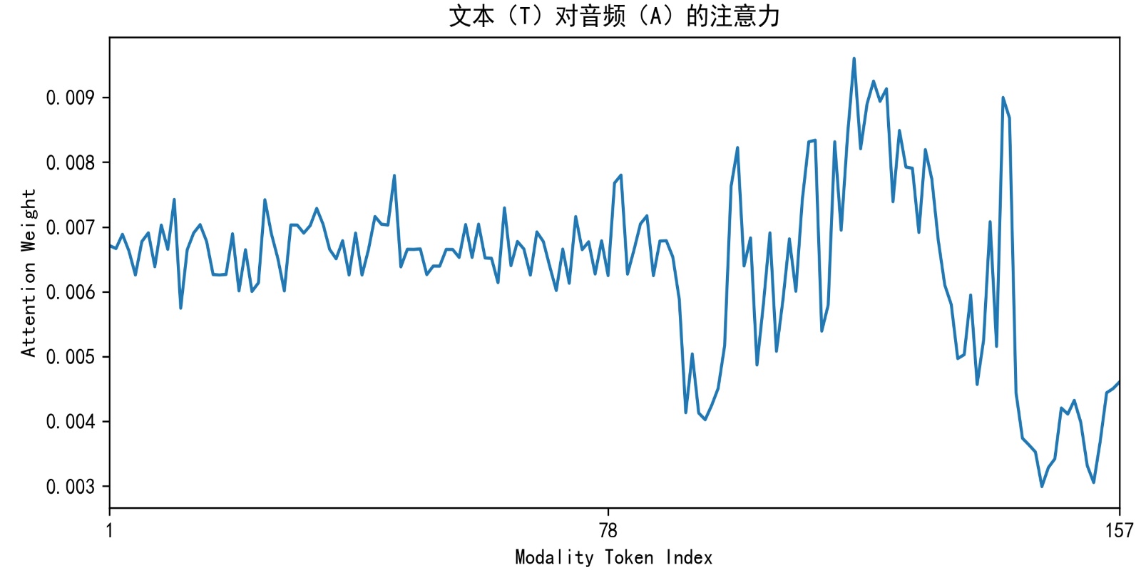 在SMIS-V2数据集上,注意力图的横坐标表示Token序列索引,其中偏后的索引位置对应的是占位Token (用于序列长度统一),这些Token不参与实际信息交互,因此没有有效注意力权重。不同模态横坐标范围不一致,是由于不同模态数据本身的序列长度不一致,最终导致了生成的伪Token的实际长度也不同。从图3可知,在训练过程中模型对视觉和音频模态的伪Token有着不同程度的关注度,在有效伪Token的范围内尤其明显,最高点往往意味着模型捕捉到了与文本模态信息最为密切相关的视觉和音频模态信息,充分说明跨模态伪Token适配器对LLM进行多模态情感分析具有十分重要的作用。