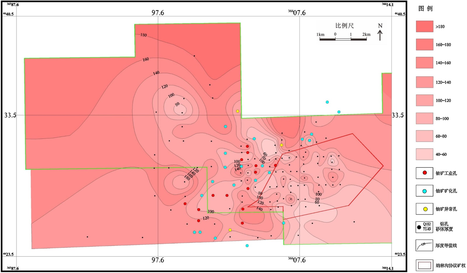通过对以往320口煤孔测井自然伽玛曲线进行重新解释,发现区域钻孔均存在不同程度的放射性异常,而且层位主要位于侏罗系中统直罗组(J2z)较连续的河流相砂体地层,岩性以粗、中、细粒砂岩为主。这些钻孔的自然γ强度异常明显,自然伽玛值多在700 API以上。其中大于2000 API的范围位于研究区西部及东南地区,面积约为105 km2;大于3000 API的范围约为35 km2,具有很好的找矿前景(图7)。