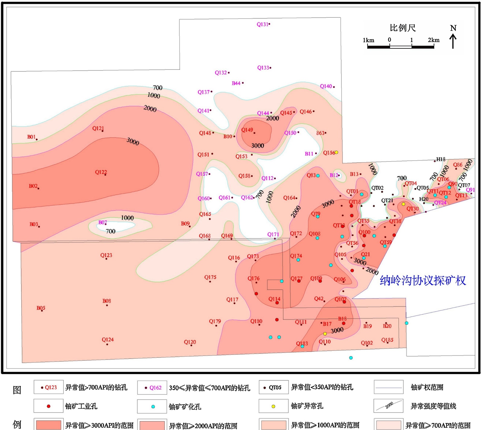 Figure 7. Radioactive anomaly intensity (API) contour map of boreholes in Taran Gaole area, northeastern Ordos Basin