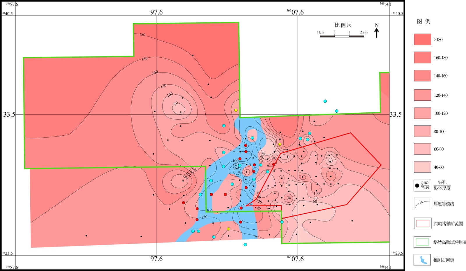 2) 根据目的砂层的构造、以往煤孔的放射性异常及古河流的展布,主河道砂体发育于河道间沉积与心滩沉积,有利于成矿,为铀矿富集部位。同时在河道分叉部位铀矿最为富集,且分布范围较大,具有较大的找矿潜力,可作为今后找矿的重点区域。