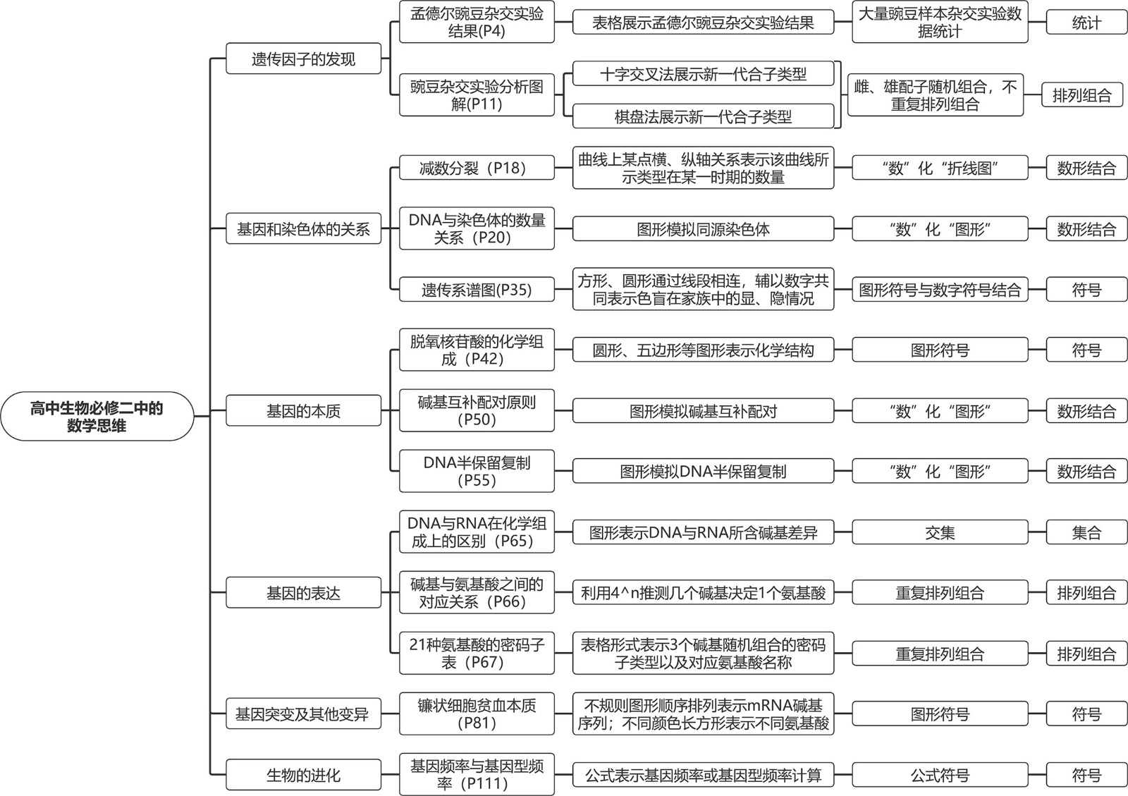 《教育部等十八部门关于加强新时代中小学科学教育工作的意见》规定跨学科主题学习原则上应不少于10%的教学要求。在此大背景下,生物学教学过程中常常会融合其他学科知识进行交叉教学,帮助学生学好生物学科的同时,迁移其他学科知识学以致用,提高综合素质水平。数学是自然科学发展的基石,能将许多概念和规律转化为抽象的数学语言,所包括的数学思维种类丰富,能很好锻炼学生的逻辑思维能力,化繁为简,化抽象为具体,由此对数学思维的应用不仅限于数学学科,在其它学科中也常被借鉴使用。数学思维是以“三会”(用数学的眼光观察现实世界、用数学的思维思考现实世界、用数学的语言表达现实世界)为核心导向,由思维活动、思维环境、思维映射、思维层级及思维主体构成的结构化认知系统[7]。在认知过程中以推理为核心,通过演绎、归纳、统计等具体逻辑方法解析问题本质、构建认知关联的高阶思维形式[8]。其跨学科价值突出体现在打破单一学科壁垒,实现数学工具与生物学科核心知识的深度融合,为生物现象的精准解读提供逻辑支撑。