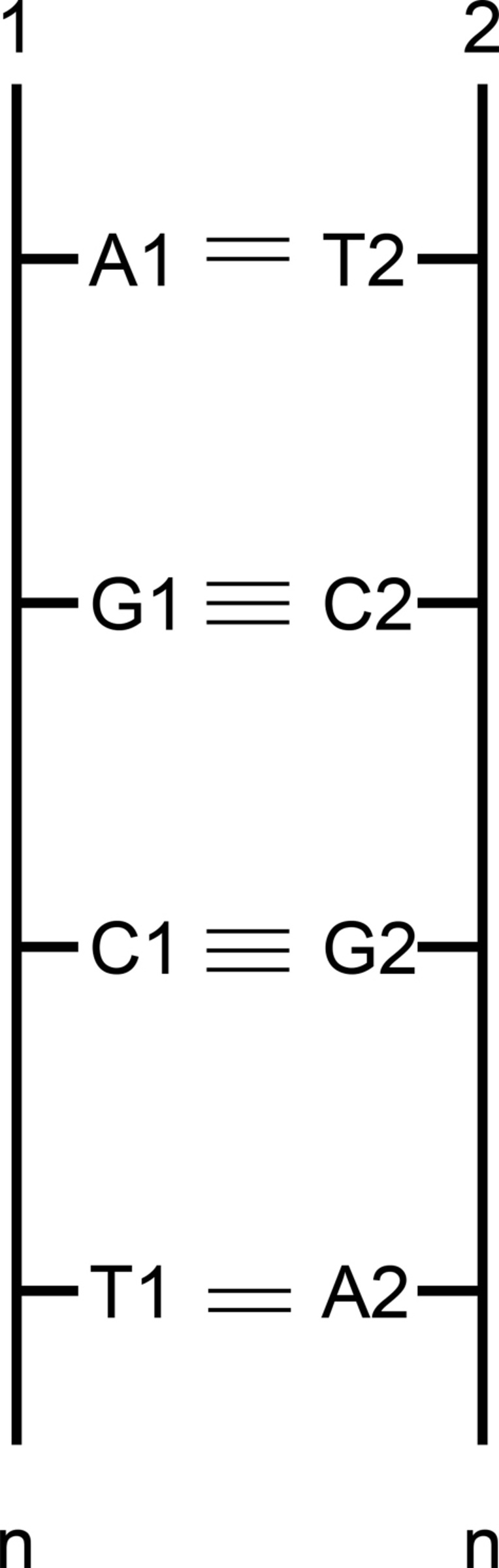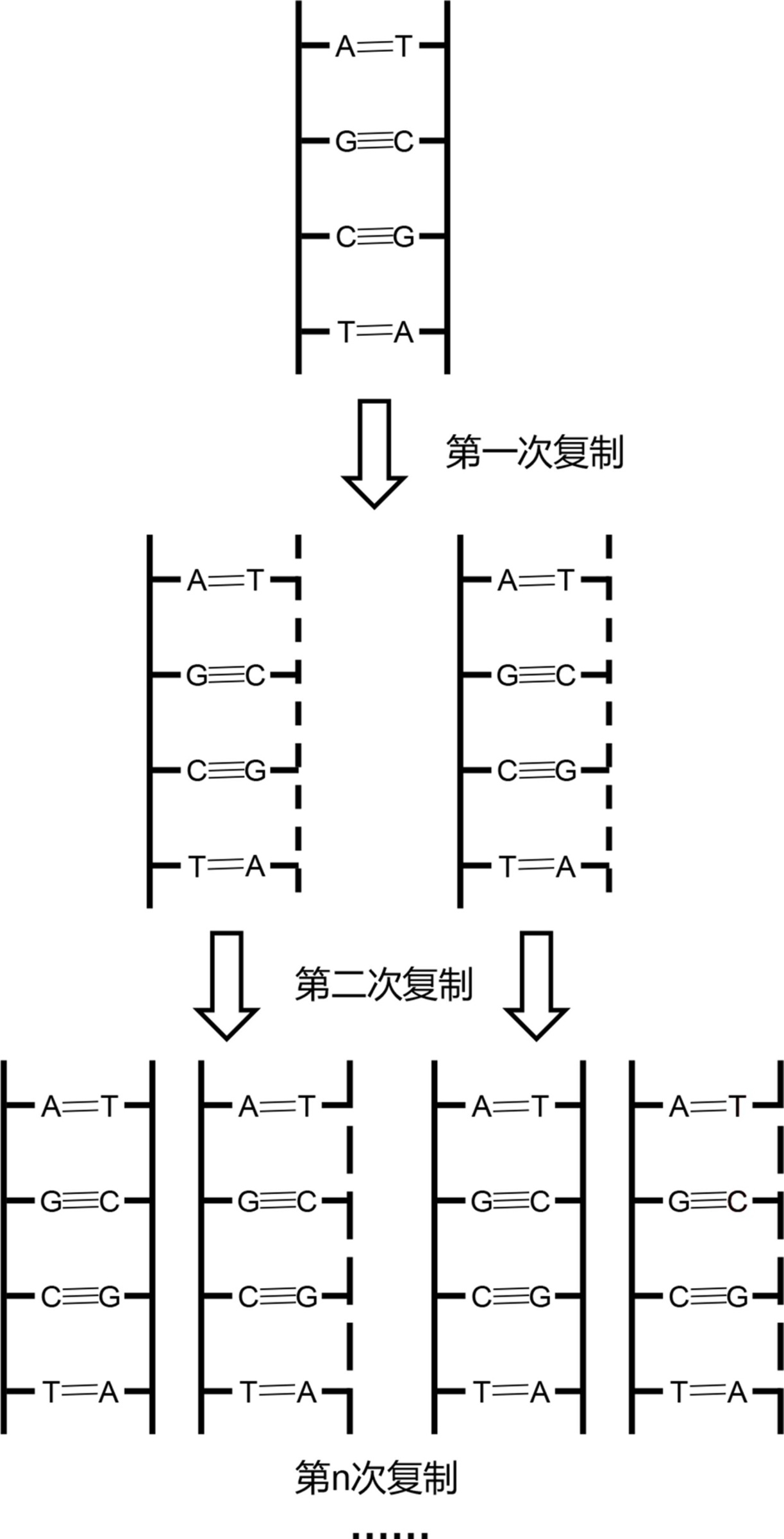 脱氧核糖核苷酸简称DNA,包括一分子含氮碱基、一分子五碳糖和一分子磷酸基团。DNA的构成中,含氮碱基扮演着关键角色,它们共有四种类型,分别是腺嘌呤(A)、鸟嘌呤(G)、胞嘧啶(C)以及胸腺嘧啶(T)。常规化学结构式书写复杂且不便记忆,用数学图形符号表示DNA,则可化繁为简(教材第42页的图3-1)。图中部标有大写字母P的圆形代表磷酸基团,五边形代表五碳糖,4种不规则图形分别代表4种含氮碱基,数学图形符号的使用省略了DNA大部分特征,但保留了必要的科学特性。比如磷酸基团化学结构式整体为圆形,故选用圆形代表磷酸基团。碱基之间遵循互补配对原则,即A与T配对,G与C配对,代表碱基A的图形与代表碱基T的图形右部可以无缝拼接,代表碱基G与碱基C的图形同理。