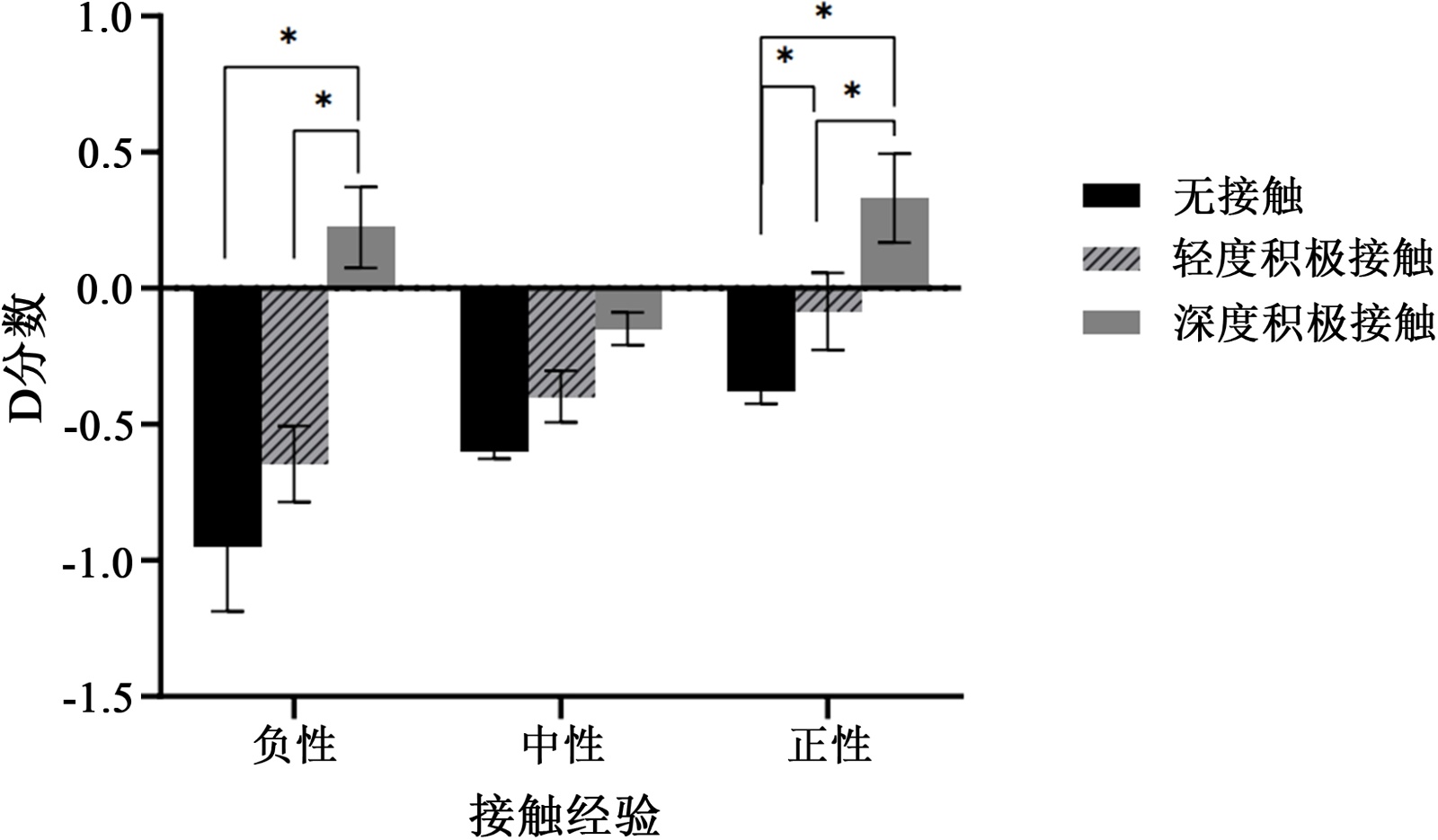 本实验采用3 (接触经验类型:负性接触、中性接触、正性接触) × 3 (想象接触积极程度:无接触、轻度积极想象接触、深度积极想象接触)两因素被试间设计。因变量为内隐偏见的相应指标,即D分数。