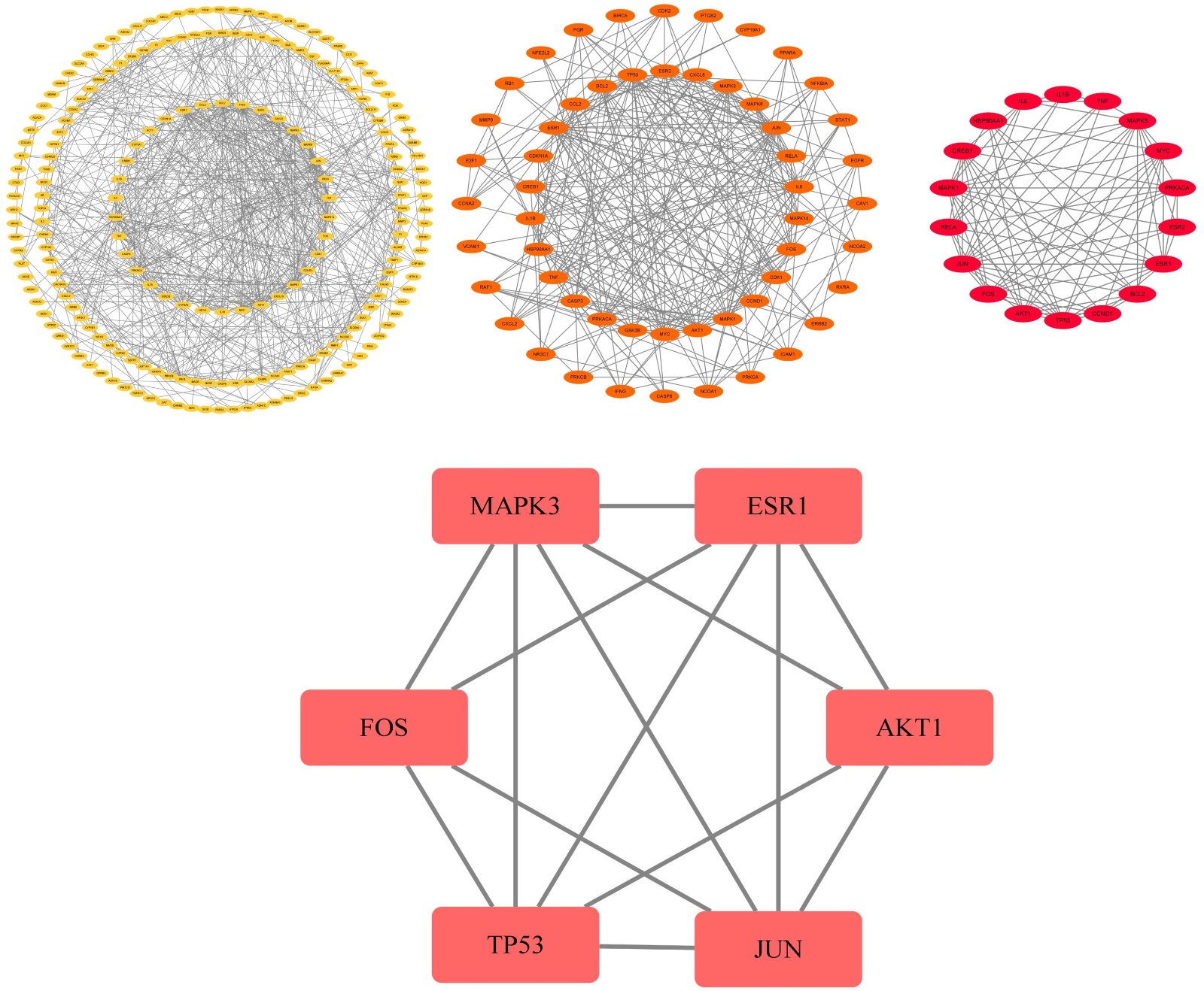 本研究通过分子对接证实乌药–延胡索–川楝子等9味药材的5种代表性活性成分(柚皮素、槲皮素、表儿茶素、黄连素、荷包牡丹碱)可与慢性前列腺炎相关的六个关键靶点(ESR1、AKT1、MAPK3、JUN、TP53、FOS)形成稳定复合物,结合能大部分 ≤ −5.0 kcal·mol−1。研究结论认为,前泌通片通过多成分、多靶点、多通路的方式,在抑制血管生成、调节细胞凋亡、纠正代谢紊乱等方面发挥作用,从而治疗慢性前列腺炎。并从分子层面系统性地预测了前泌通片治疗慢性前列腺炎的“活性成分–作用靶点–信号通路”网络,为阐释其“多靶点、整体调节”的特点提供了科学假设和分子生物学依据。通过网络药理学研究了前泌通片对慢性前列腺炎的潜在影响,指导建立从分子互作验证的研究体系,为后续深入探索奠定了基础。