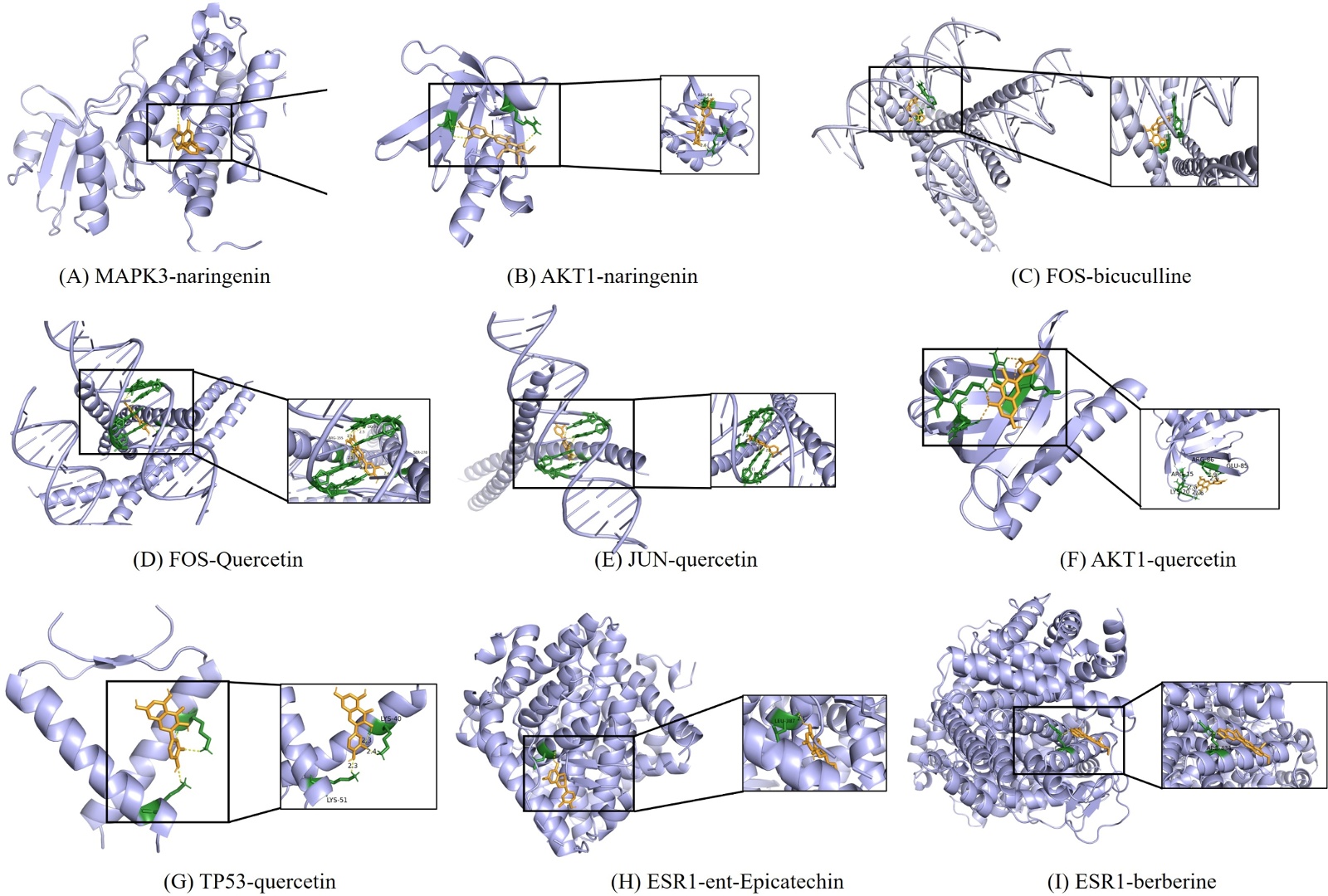 图6. 部分前泌通片活性成分与慢性前列腺炎关键靶点蛋白分子对接示意图
