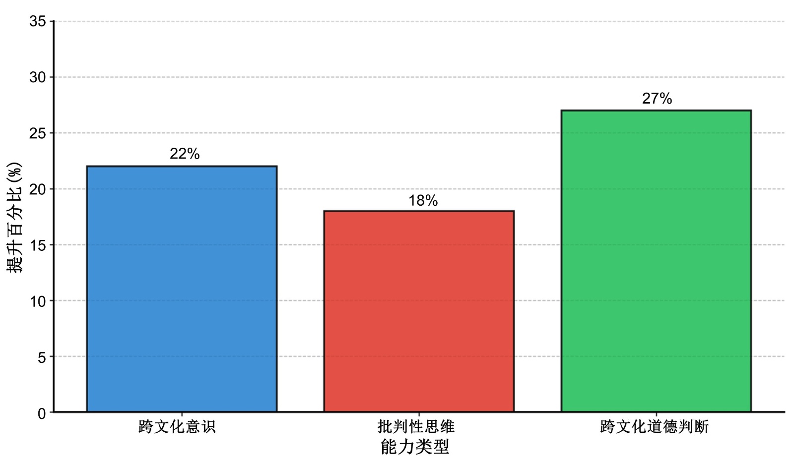 与此同时,笔者也对在测试中加入的全球胜任力问题的答题情况进行了分析,结果表明,AI新形态教材在培养学生全球胜任力的以下方面也取得了积极的效果(图2)。学生在跨文化意识方面的得分,经过系统地学习和实践后,平均提高了22%。这一显著的进步表明,学生们对不同文化的理解、尊重和适应能力得到了有效提升;与此同时,在批判性思维测试中的表现也呈现出令人欣喜的增长,其平均提升幅度达到了18%,这说明他们在分析问题、评估证据以及形成独立见解等方面的能力均有所增强;另外,在涉及跨文化道德判断的情境模拟题中,学生的正确判断率更是出现了大幅度的提高,增幅高达27%,充分体现了他们在面对复杂多元文化情境时,能够更加准确地运用道德准则进行合理判断的能力。