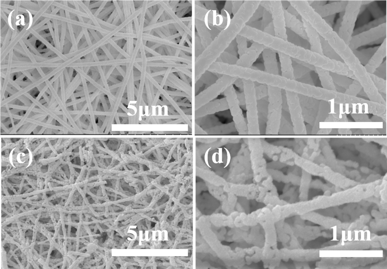 图1. BiFeO3 NFs (a)和(b)和BiFeO3/Ag NFs (c)和(d)在不同倍率下的SEM图像