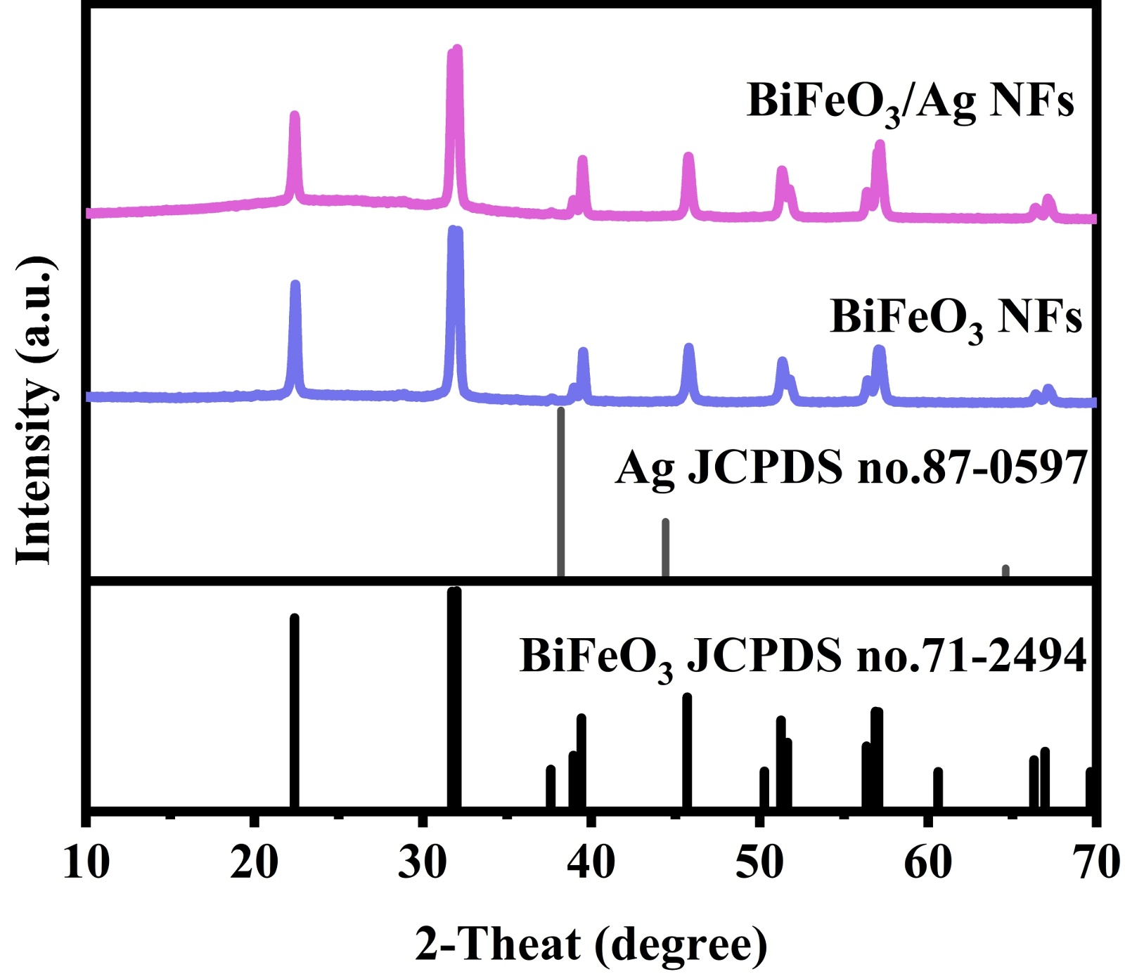 图2. BiFeO3 NFs、BiFeO3/Ag NFs的XRD图像