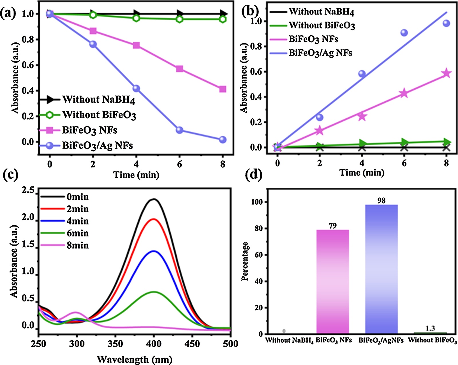 Figure 4. (a) Comparison of 4-NP degradation; (b) Reduction rate within 8 minutes; (c) Ultraviolet-visible absorption spectra of 4-NP reduction catalyzed by BiFeO3/Ag NFs composites; Comparison of the removal rates of 4-NP reduction in different samples; (d) Comparison of the removal rates of 4-NP reduction in different samples