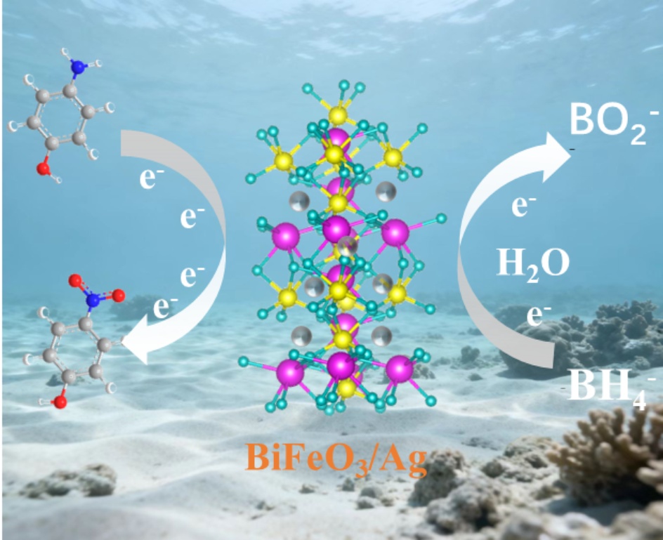 4-硝基苯酚(4-NP)是一种常见的化工中间体,广泛应用与农药、医药、染料等行业。4-硝基苯酚的过量使用已造成严重的环境负担,其中水污染问题尤为突出,对生态环境及动植物、人类健康构成严重威胁[1] [2]。因此,对硝基苯酚被认为是环境污染中具有代表性的污染物。根据已有文献,降解4-硝基苯酚污染的方法主要包括物理吸附法、微生物处理法及化学氧化法。但这些方法存在能耗过高、产生二次污染、效率低下等难以避免的问题[3] [4]。值得关注的是,4-硝基苯酚的还原产物对氨基苯酚(4-AP)具有良好的生物降解性,常作为医药原料、照相显影剂及染料生产的反应中间体[5] [6]。因此,寻找高效催化剂,通过选择性加氢还原将对硝基苯酚的硝基转化为对氨基苯酚,具有重要的现实意义与紧迫性[7]。贵金属催化剂(如:Au、Ag、Pt等)因其高功函的特性被广泛应用与4-NP的还原。但其表面自由能高易引起团聚,进而导致催化活性明显下降的缺点较为明显。为了解决这一问题,研究人员致力于将贵金属负载到一维纳米纤维材料表面,防止贵金属团聚并增加与反应物接触面积[8] [9]。并且由于磁性材料可以进行磁分离的特性,纳米复合材料可以使用外部磁铁从反应混合物中分离出来,降低催化剂的损失。铁酸铋(BiFeO3)因为其良好的可见光响应能力,优异的稳定性以及磁可分离特性,受到了广泛的关注和研究[10]。磁性BiFeO3纳米纤维由于其良好的稳定性、易于分离和卓越的催化作用,已被用于亚甲基蓝,罗丹明B等污染物的降解[11] [12]。