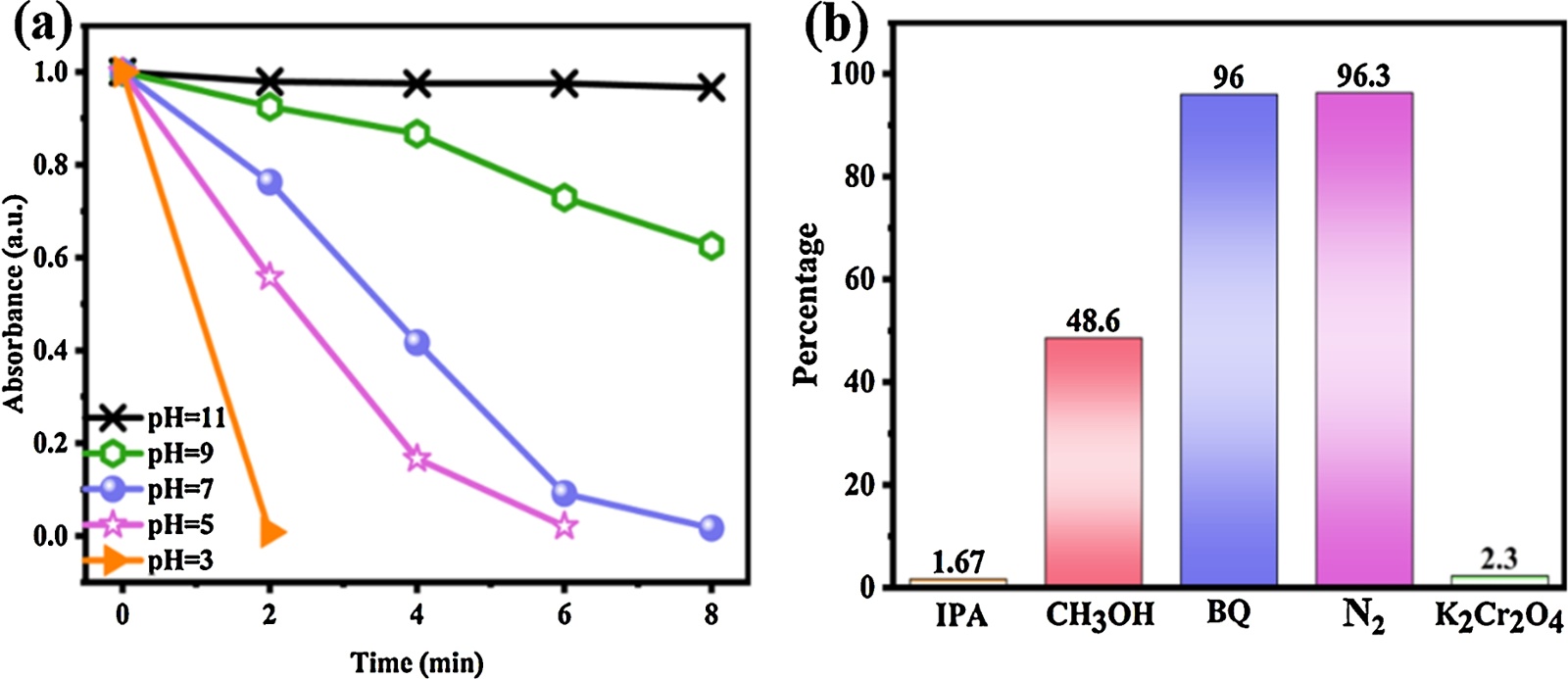 Figure 6. (a) Comparison of BiFeO3 /Ag NFs reduction of 4-NP in different pH environments; (b) Comparison of the effects of different scavengers on the reduction of BiFeO3/Ag NFs to 4-NP