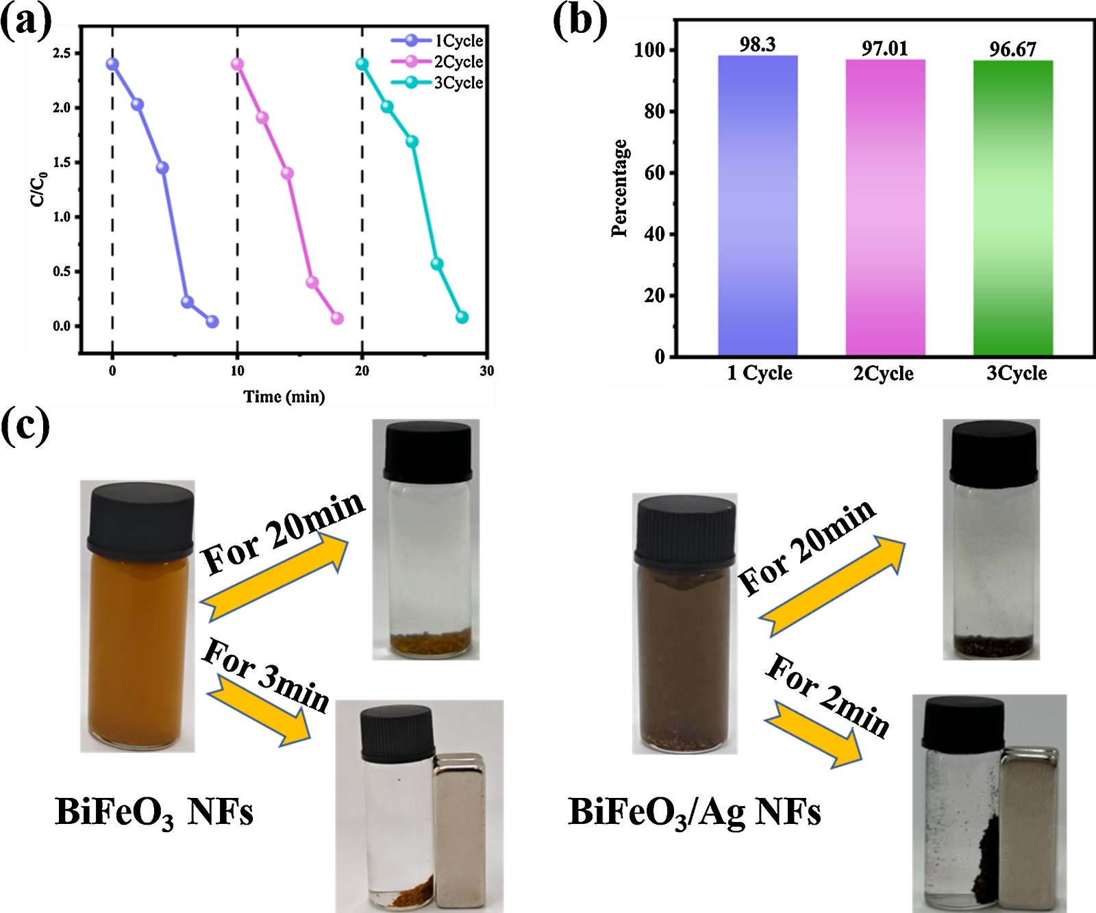 Figure 7. (a) Cyclic catalytic test images of BiFeO3/Ag NFs; (b) Histogram of Cyclic cataiytic test; (c) Schematic diagram of magnetic recovery