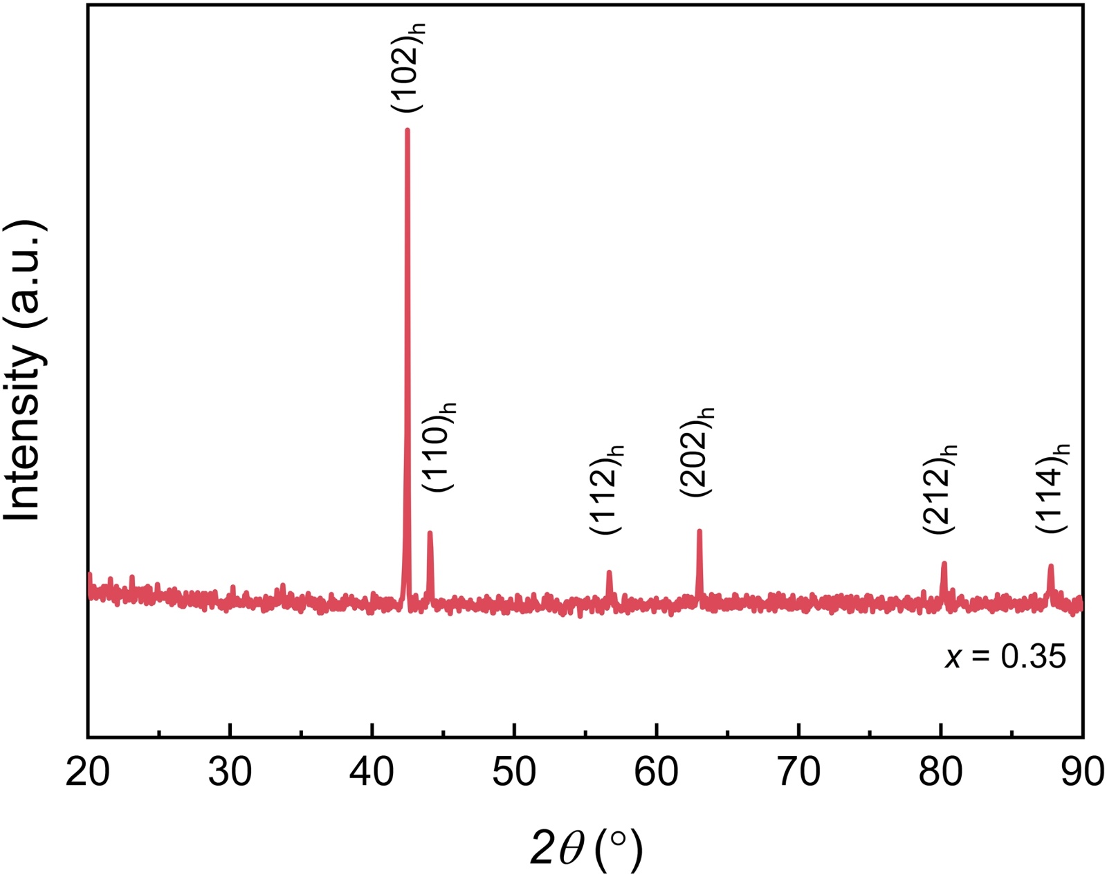 图1为Mn0.65NiGeFe0.35的室温XRD图谱。该样品的XRD结果表明,所有衍射峰均能与Ni2In型六角结构MnNiGe合金(空间群为P63/mmc)的标准卡片相对应,未出现其他杂质相的衍射峰,说明在该成分范围内样品均保持单一六角母相结构。这证实Fe原子成功固溶于MnNiGe晶格中,通过占据Mn晶格位置实现合金化,并未引起新相生成或破坏母相的结构完整性。该一致性不仅验证了样品制备与物相分析的可靠性,也表明Fe的引入未显著改变MnNiGe体系的基本晶体结构,从而为后续研究其热膨胀行为奠定了坚实的结构基础。