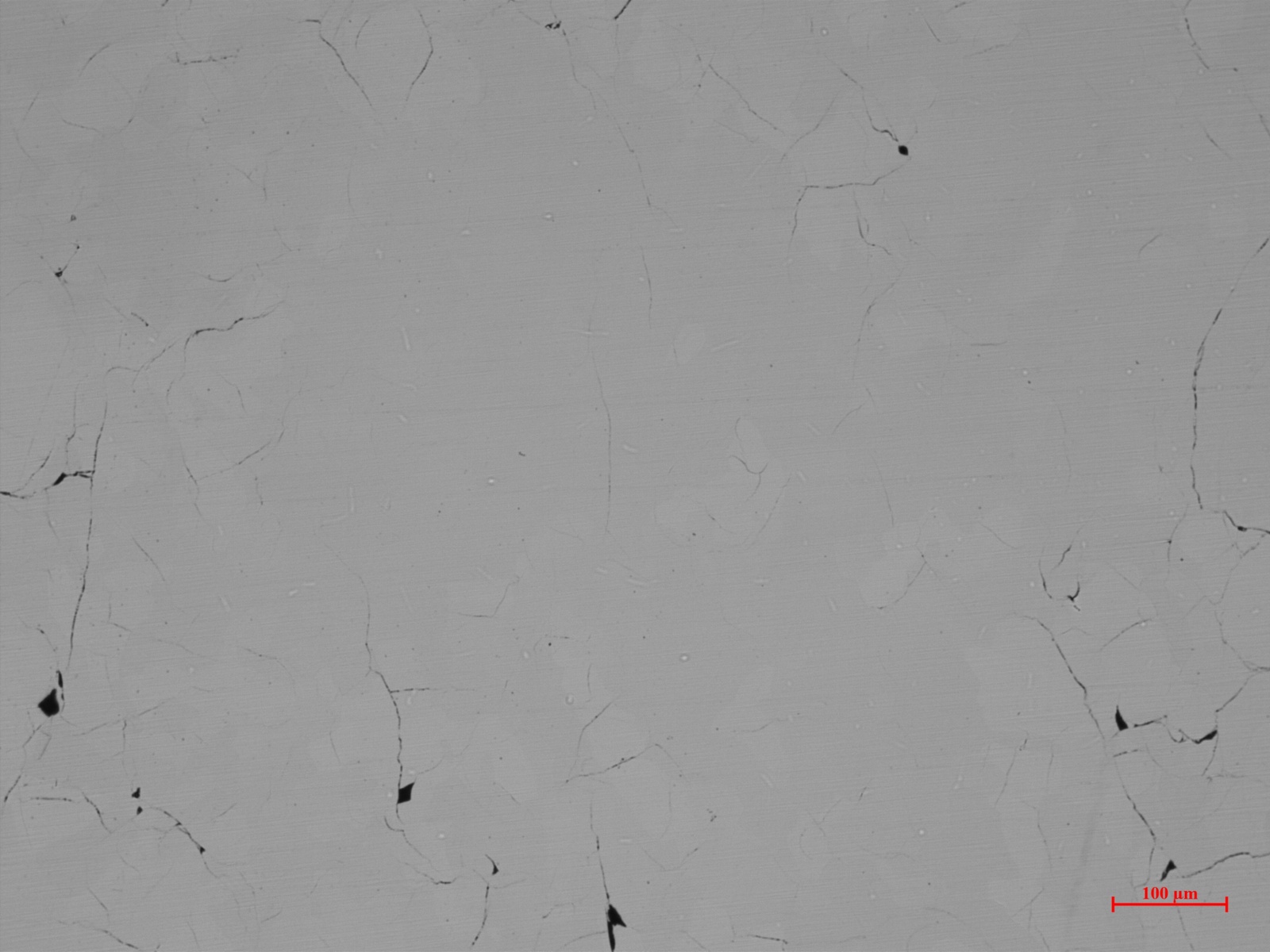 图2展示了经抛光处理后Mn0.65NiGeFe0.35合金的金相显微镜表面形貌图。图中结果显示,与未改性在室温时会自发破碎的MnNiGe合金不同,该样品表面整体平整,无明显大孔洞或连续长裂纹,仅存在少量微裂纹,显示出显著改善的表面完整性。