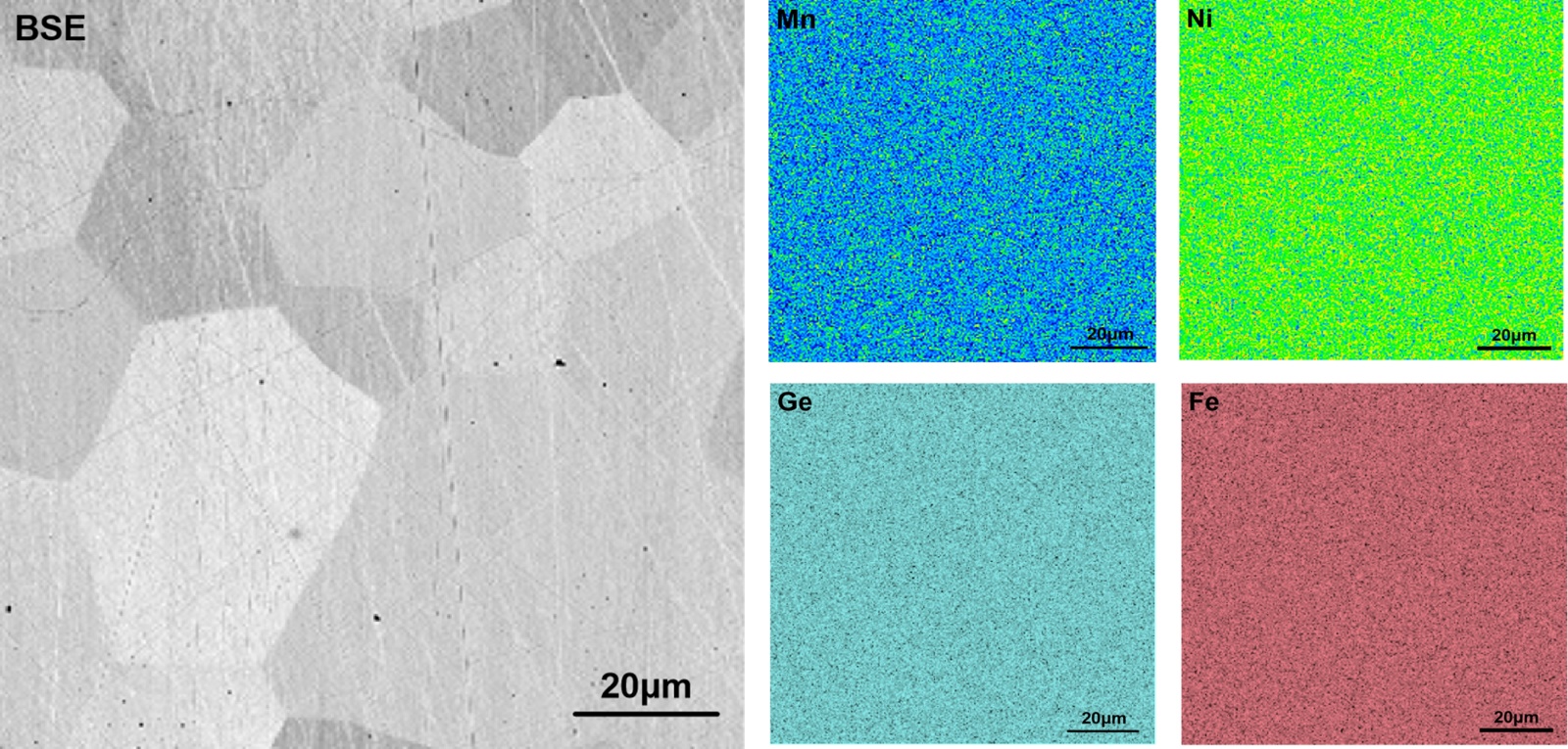 图3为Mn0.65NiGeFe0.35合金经过扫描电子显微镜(SEM)及其配套的能谱仪(EDS)表征结果。从其背散射形貌图可见,该合金由尺寸均匀、分布致密的晶粒组成,晶粒尺寸约介于20~50 μm之间,边界清晰完整,晶粒间结合紧密,无明显孔洞或微裂纹存在,表明材料具有较高的致密度与结构完整性。从EDS面扫描结果分析,Mn、Ni、Ge、Fe四种元素在样品中均呈现连续且均匀的空间分布,未观察到明显的元素偏聚或者在局部富集的现象。值得注意的是,Mn与Fe元素的分布区域高度重合,表明Fe原子在晶格中成功占据了Mn的等效占位,形成了均匀固溶体,而未形成独立的Fe富集相。该均匀的元素分布特征为合金在室温下具有单一Ni2In型六角母相结构提供了有力的成分证据。这一结果也与该合金的XRD表征相互印证。