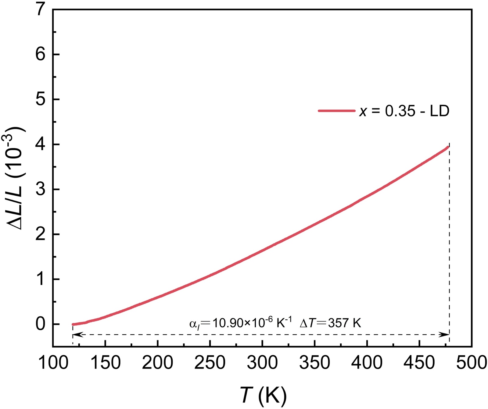 图6. Mn0.65NiGeFe0.35合金纵向(LD)热膨胀曲线
