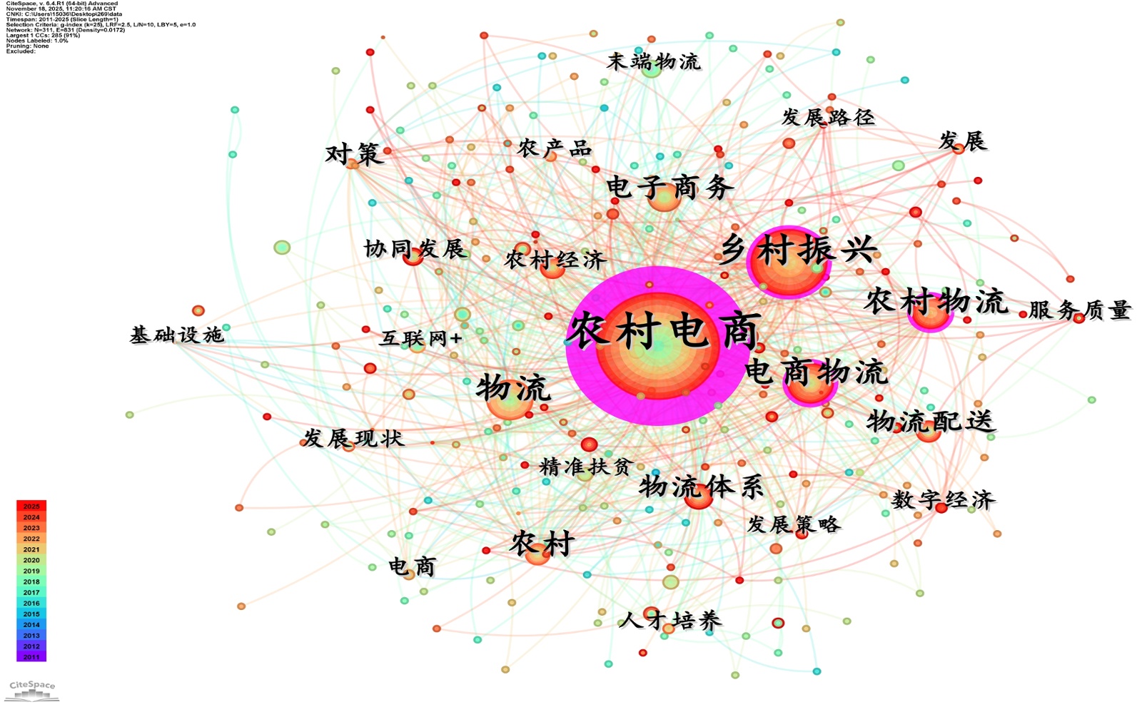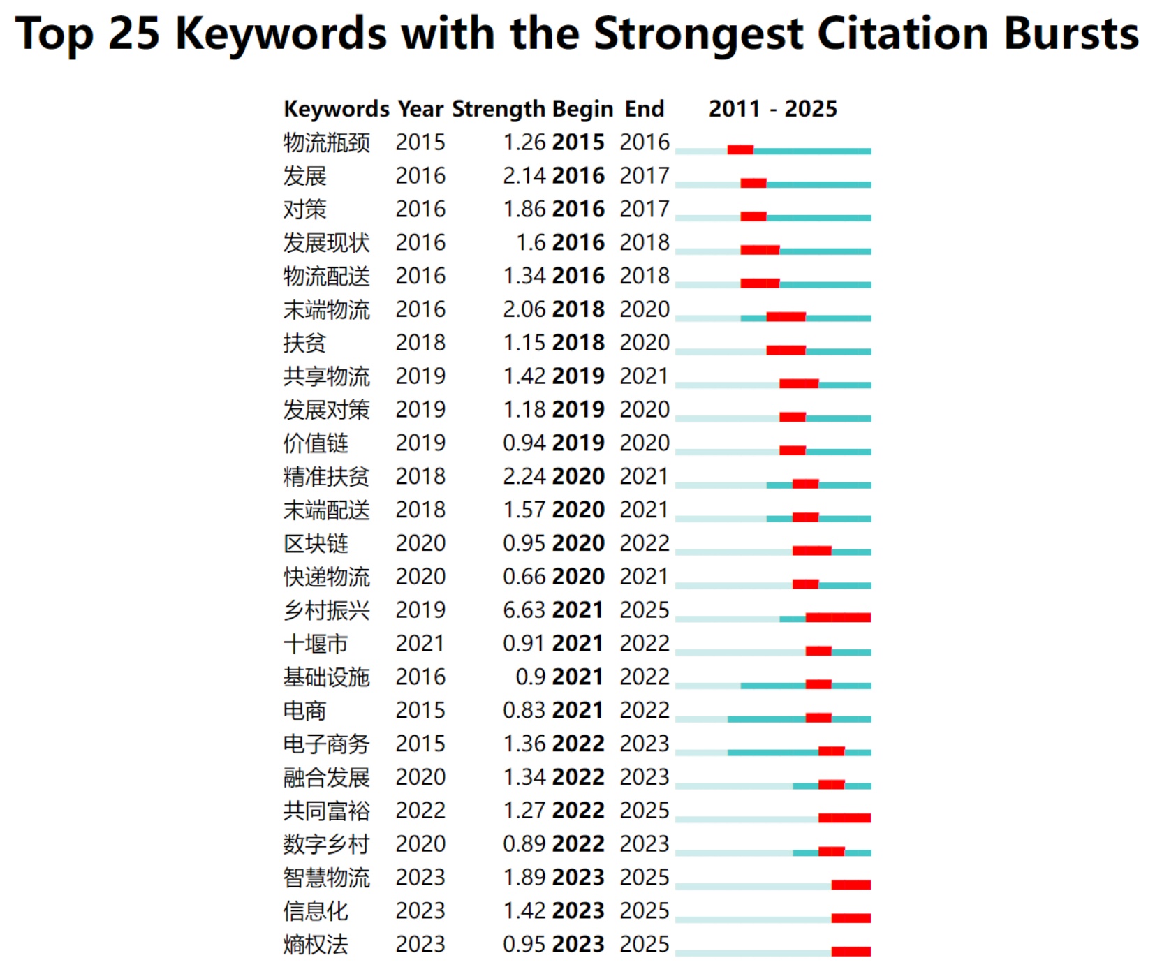 通过运用关键词突现分析图谱,得以揭示2011至2025年间农村电商物流领域的热点前沿及其演变趋势。本研究借助CiteSpace软件对相关关键词进行了系统的突现性分析,识别出了25个在该时间段内表现出显著突现性的关键词,如图5所示。这些关键词不仅代表了农村电商物流领域的关注焦点,也反映了其在电商环境下的研究方向和动态变化——从基础物流瓶颈解决到乡村振兴战略协同,从末端配送优化到数字化升级,清晰呈现了领域内关键议题随时间与实践的发展转变。