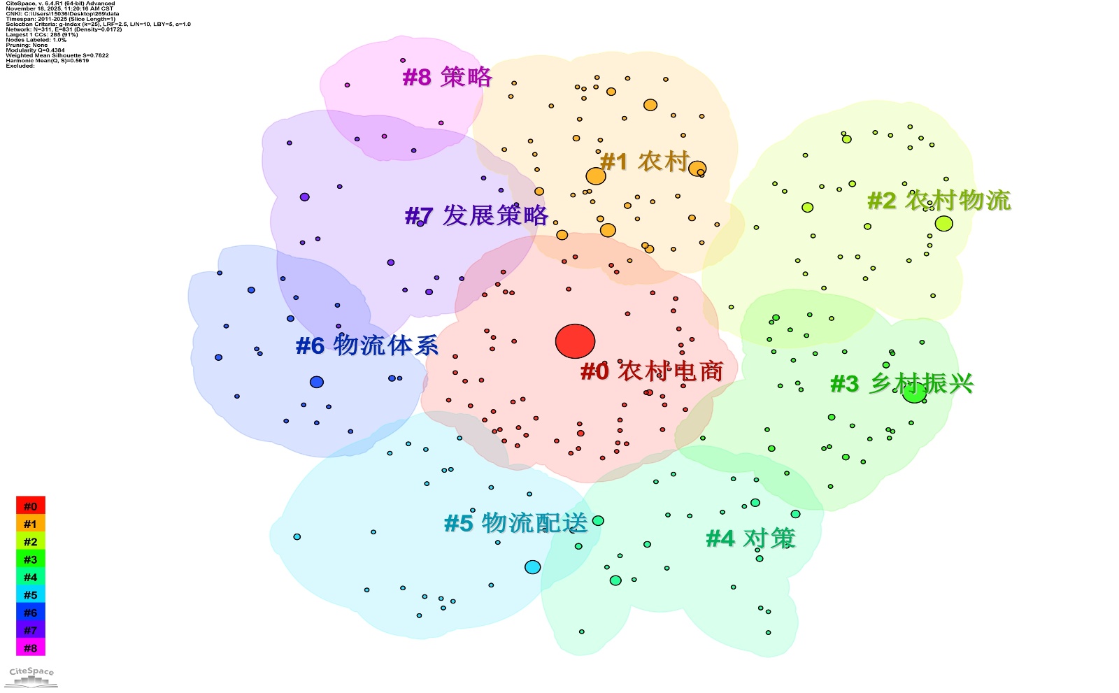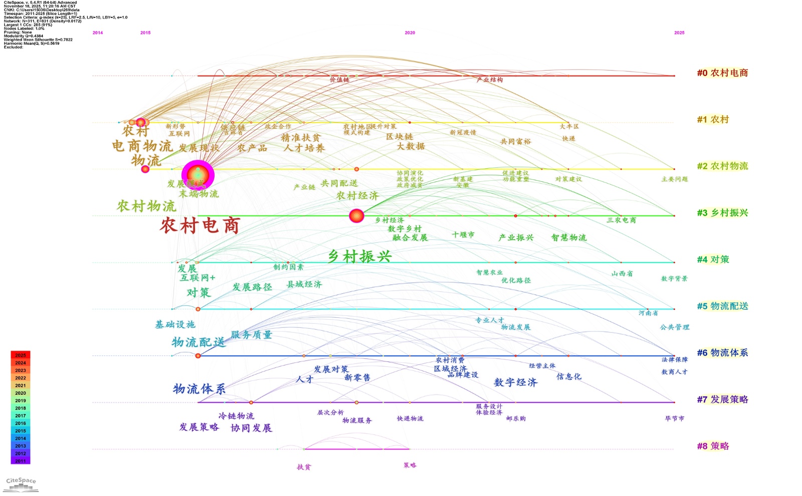 至于#4“对策”(2015~2025)、#7“发展策略”(2018~2025)、#8“策略”(2019~2025)这些问题解决导向的聚类,其“从局部到系统”的演化同样是问题与政策迭代的体现:早期聚焦“物流设施不足”“人才缺乏”等具体痛点的解决建议,对应2015~2017年农村电商物流短板集中暴露的阶段;中期转向“乡村振兴背景下的农村电商物流政策支持”等政策协同对策,是2018年乡村振兴战略下“政策–物流–产业”联动的需求;后期强调“数字化转型策略”“协同发展策略”等系统策略,则源于2023年《农村物流高质量发展实施方案》提出“数字化、协同化发展”的导向,这一过程也体现了研究从“被动解决问题”到“主动规划路径”的升级。
